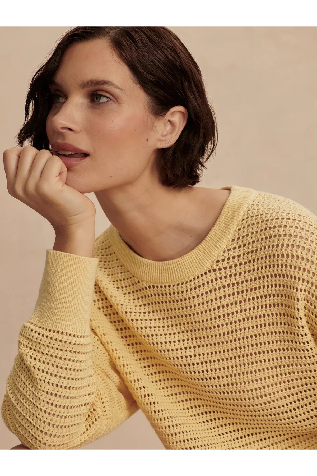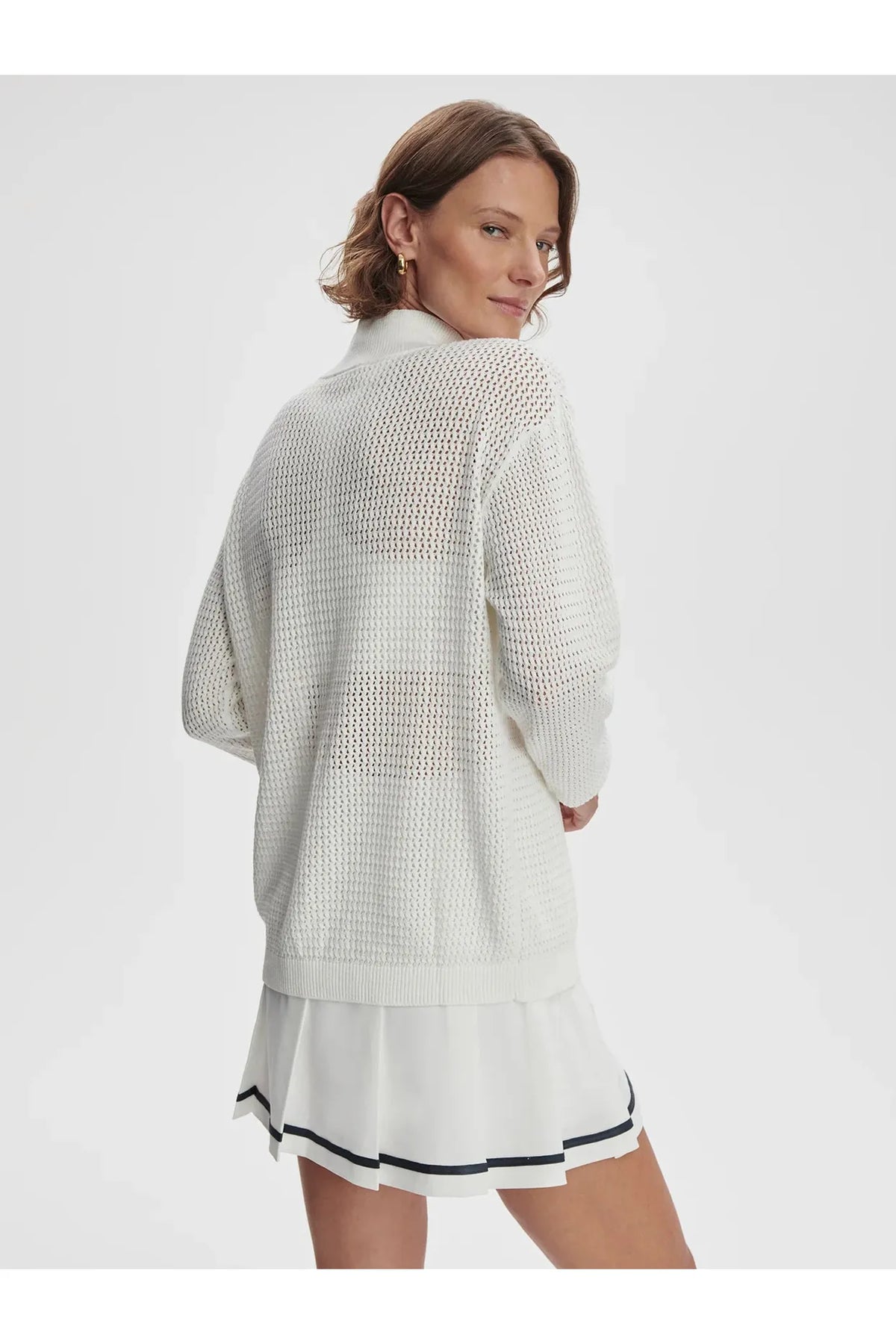 This sweater has a refined fit for versatile everyday styling. Crafted from a cotton blend bouclé yarn in an all-over mesh pointelle stitch with fashioned raglan sleeves. The texture, high-neck collar, and double-ended zip front elevate the design. By Varley. Pair with your favorite Carrie Dunham bag and cover.