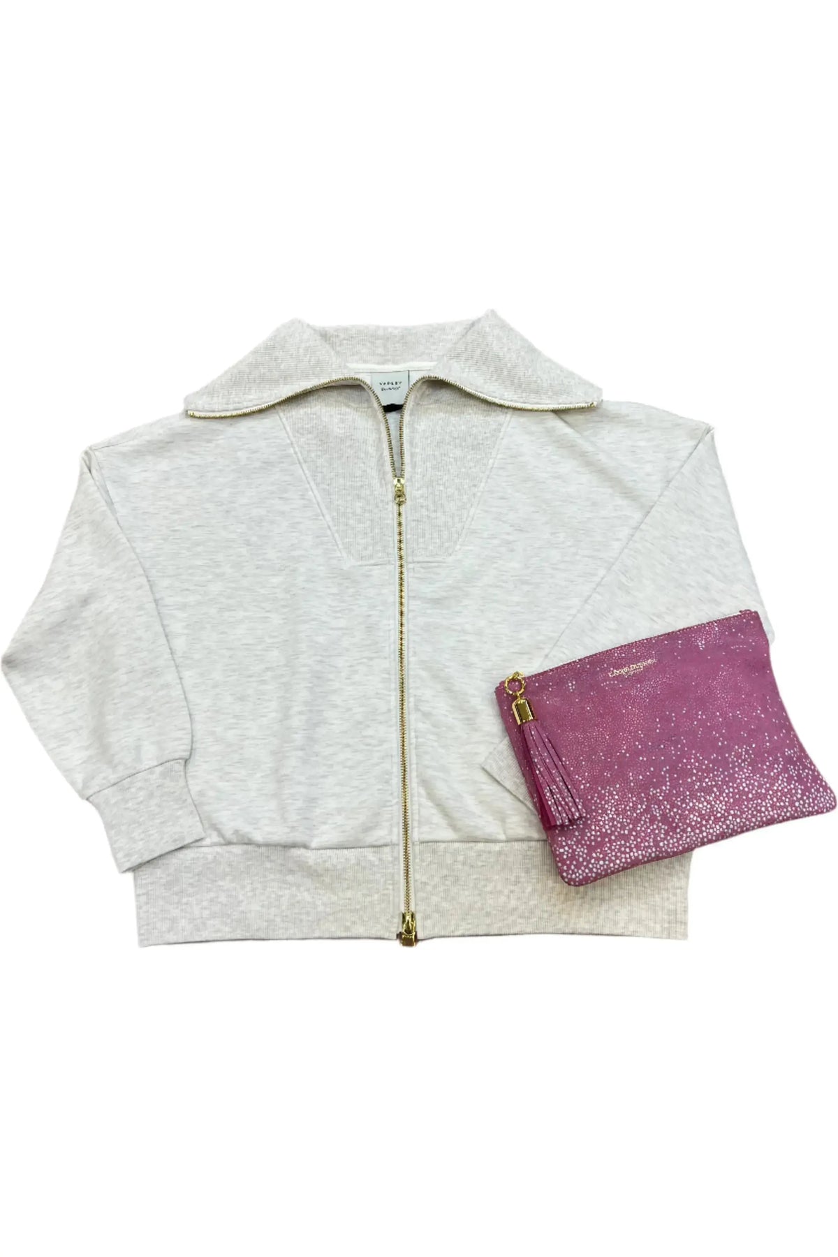 This fleece bomber jacket is a classic. It's a cozy stylish and versatile layering piece, perfect for Fall. Crafted from soft fleece with a chunky, knitted rib collar and cuffs. It offers warmth and comfort on colder days. The jacket features elegant contrast tipping along the collar and down the front. By Varley. Pair with your favorite Carrie Dunham bag!