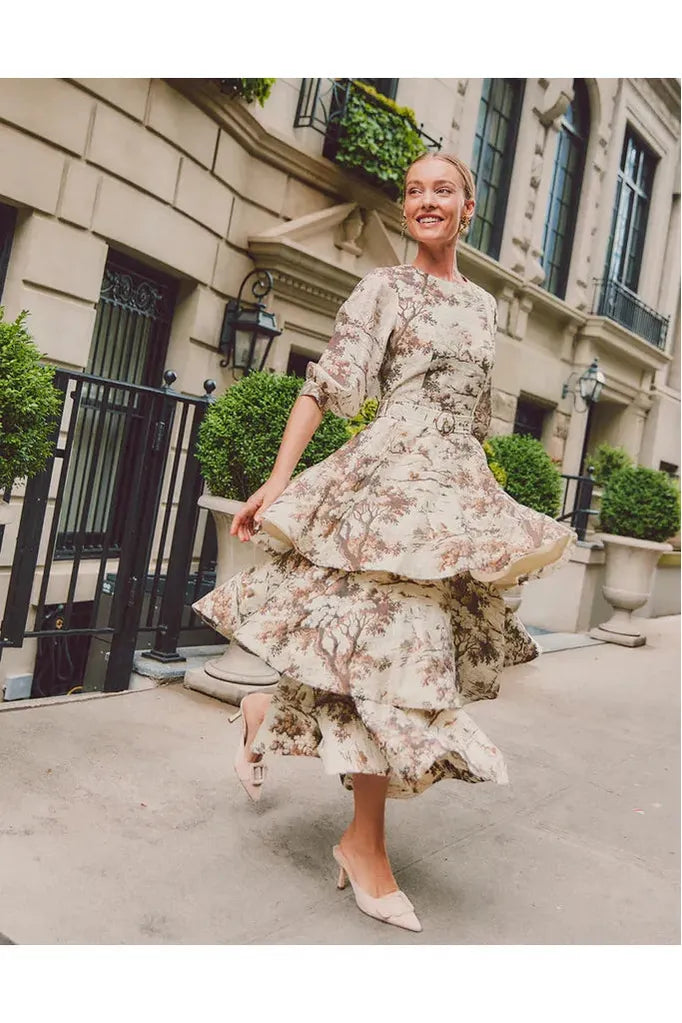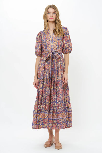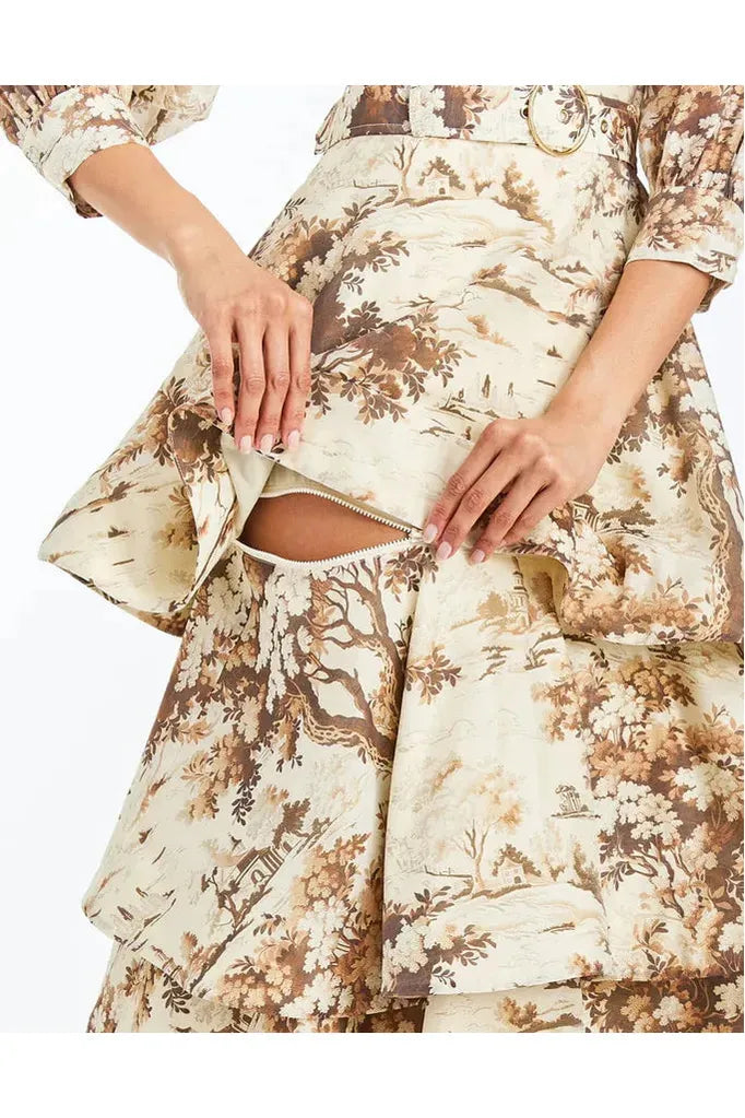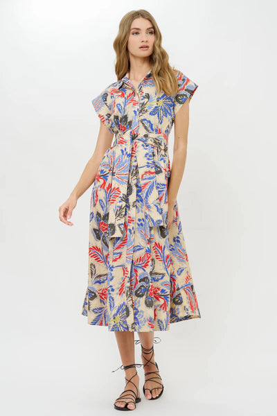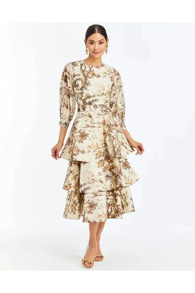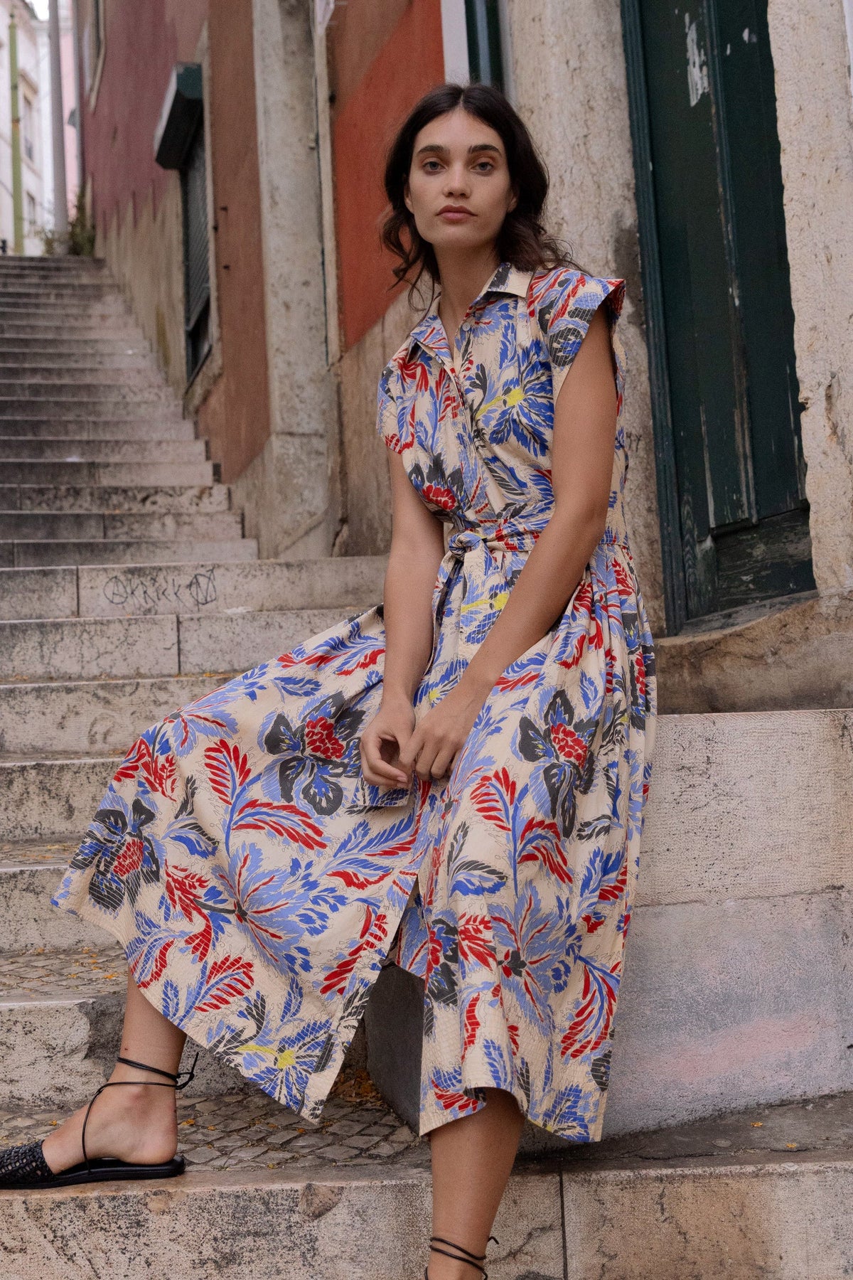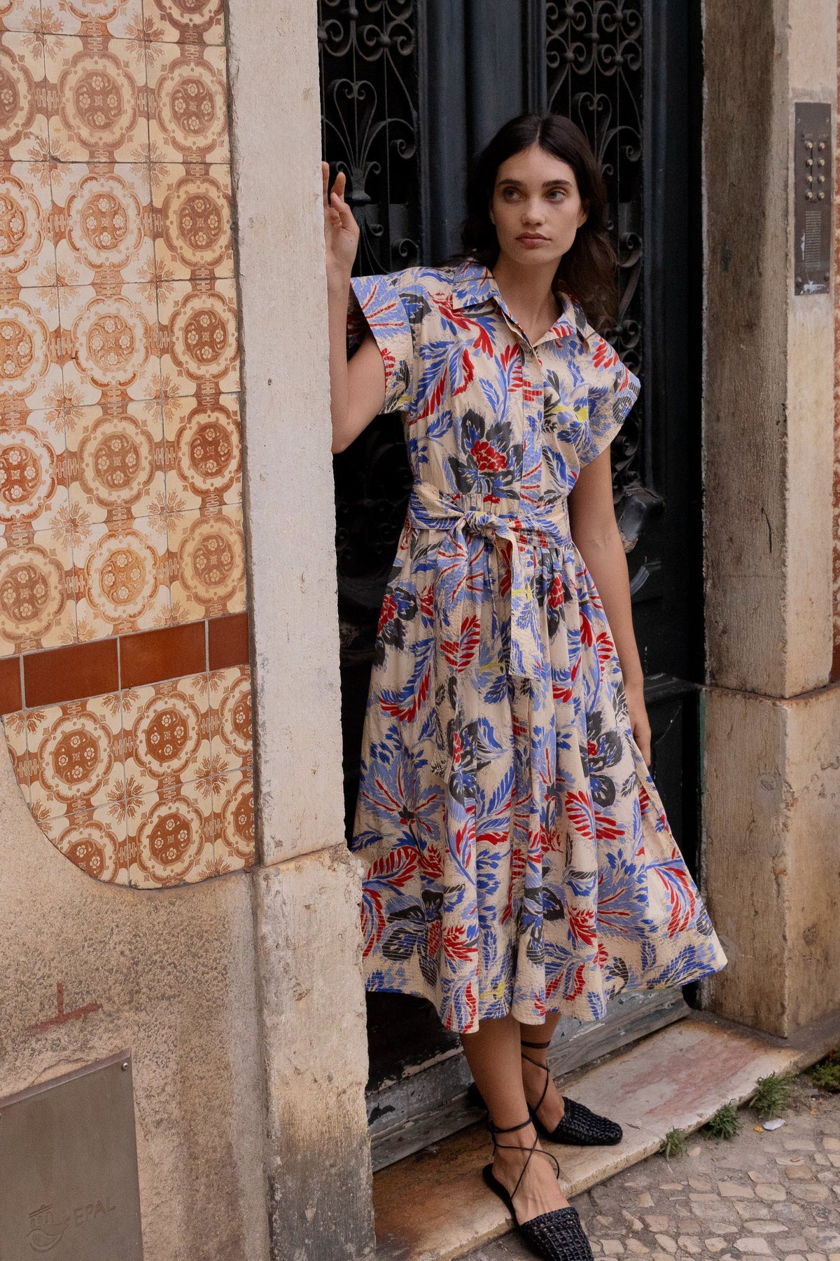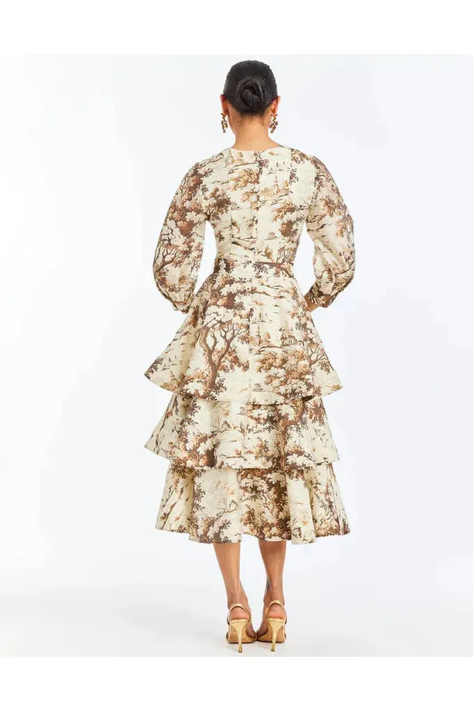 Embrace a gentle rustle of warmth with this Long Sleeve Maxi Dress. Its high neckline elegantly frames the face, while the flowing silhouette cascades in soft tiers, evoking whispered breezes. The rich macaw-inspired print blends earthy creams, ochres, and subtle blues, bringing playful vibrancy to every movement. Delicate puffed sleeves gather softly at the wrists, adding romance and charm to this enchanting maxi dress. By Farm Rio. Pair with your favorite Carrie Dunham bag and cover.
