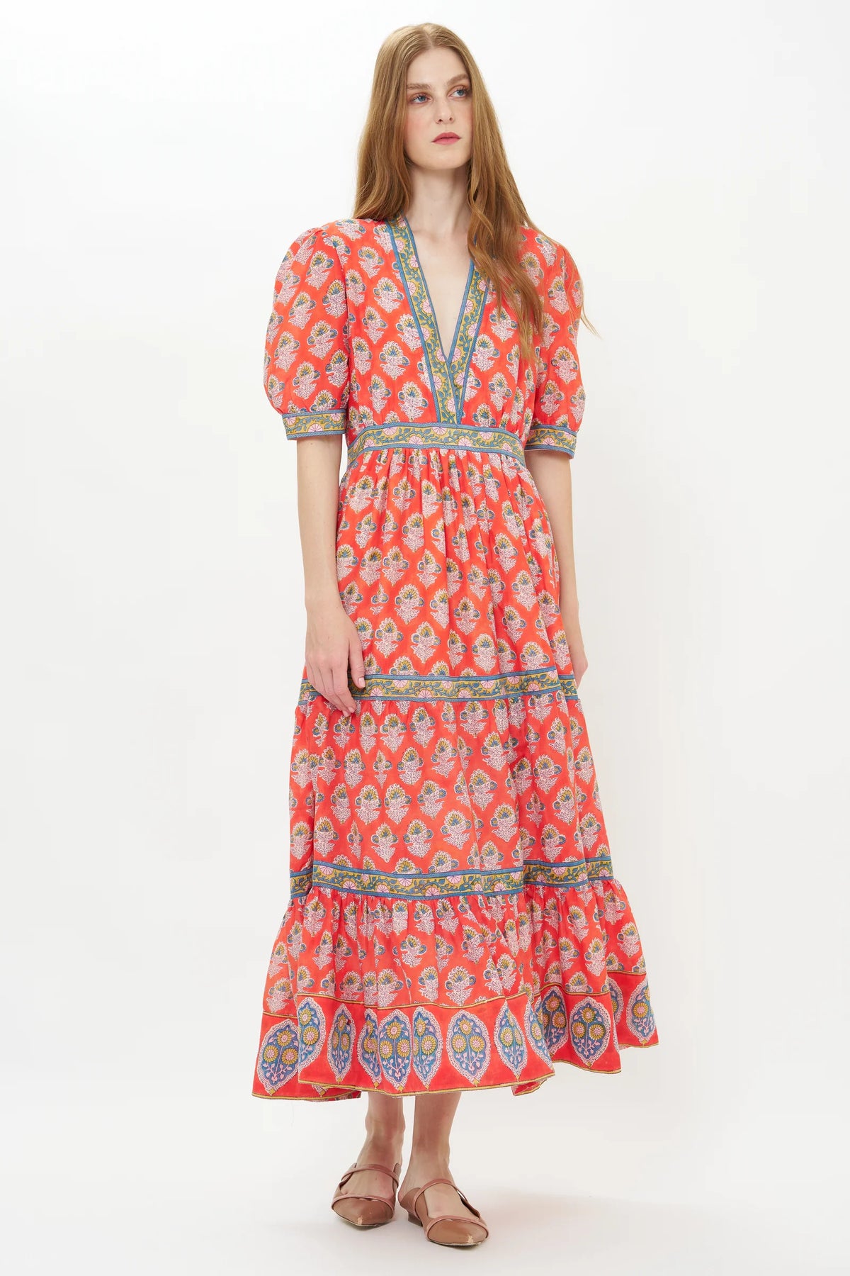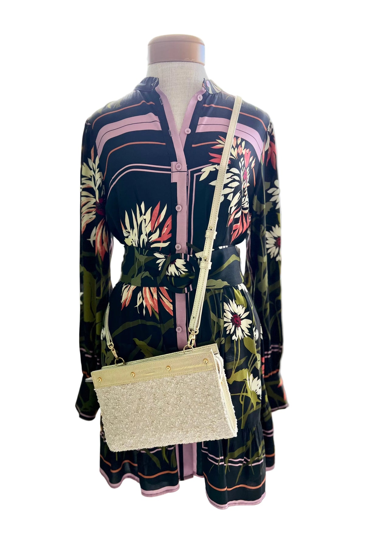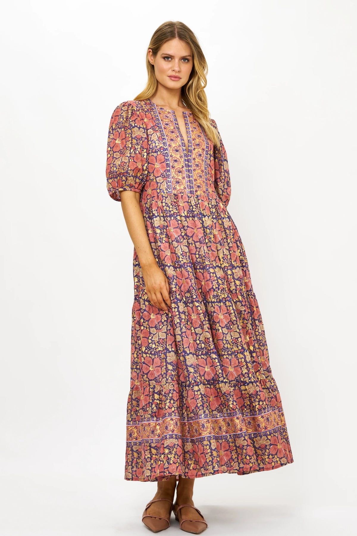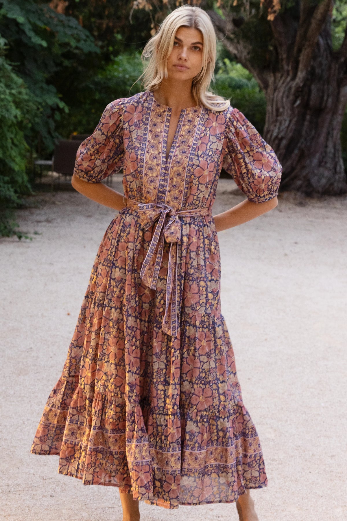 Embrace a gentle rustle of warmth with this Long Sleeve Maxi Dress. Its high neckline elegantly frames the face, while the flowing silhouette cascades in soft tiers, evoking whispered breezes. The rich macaw-inspired print blends earthy creams, ochres, and subtle blues, bringing playful vibrancy to every movement. Delicate puffed sleeves gather softly at the wrists, adding romance and charm to this enchanting maxi dress. By Farm Rio. Pair with your favorite Carrie Dunham bag and cover.