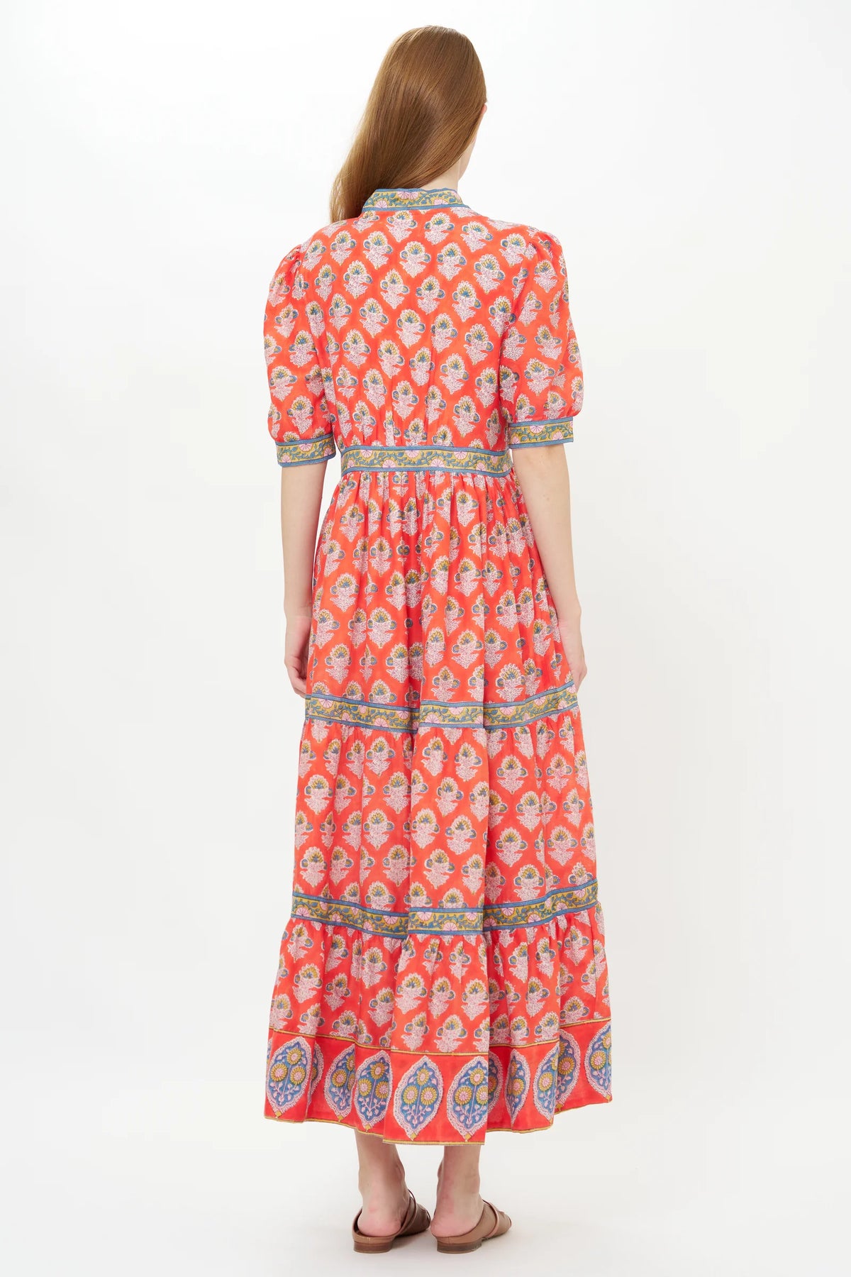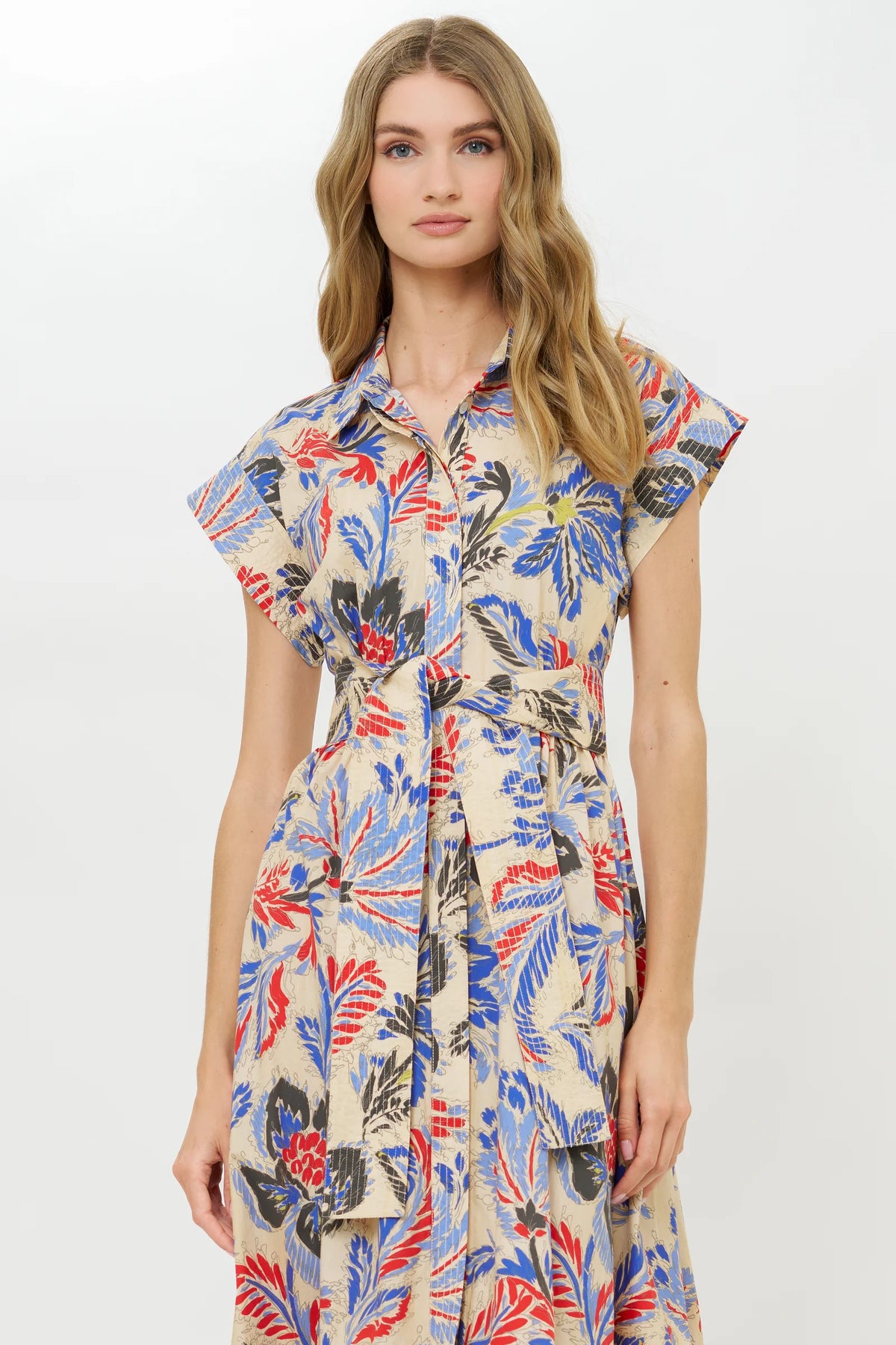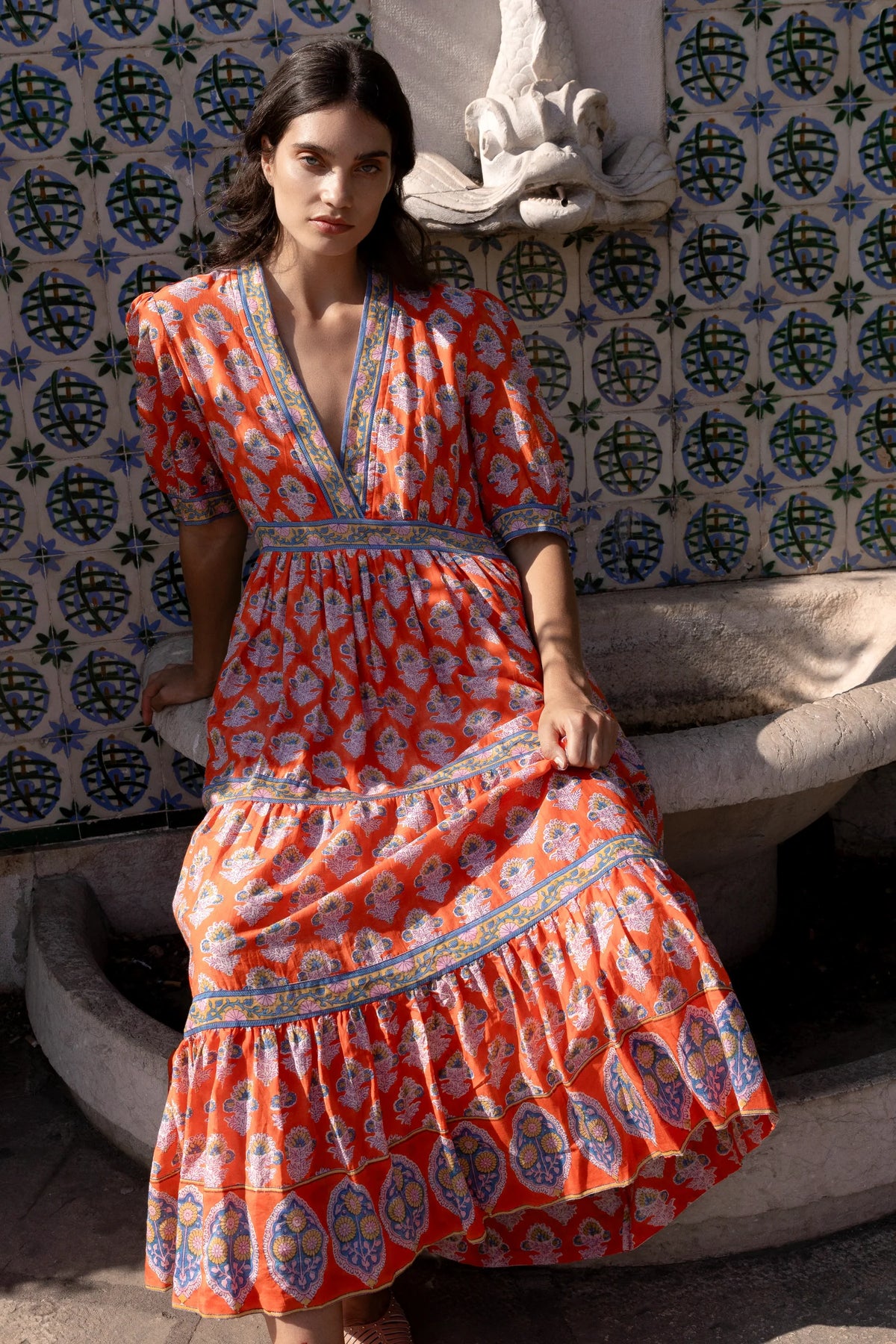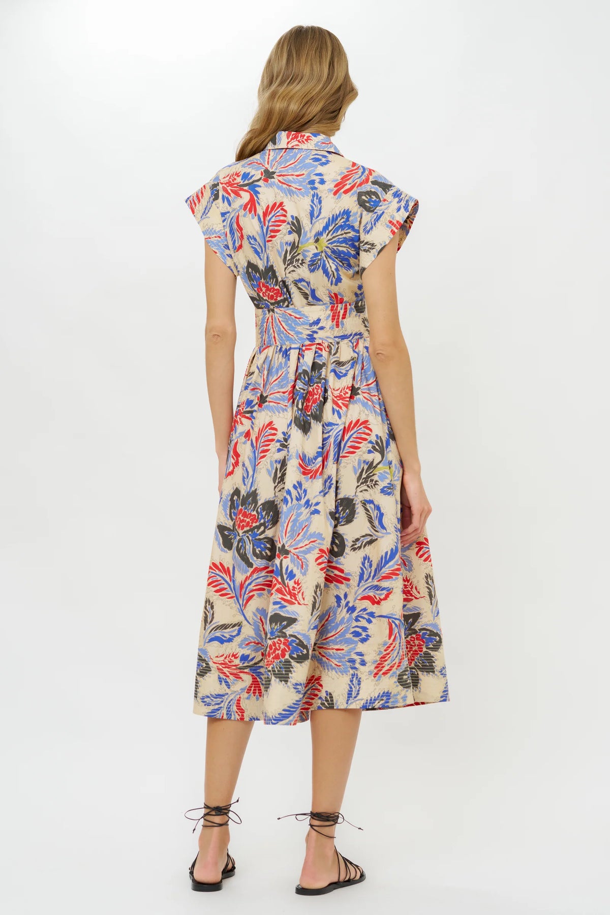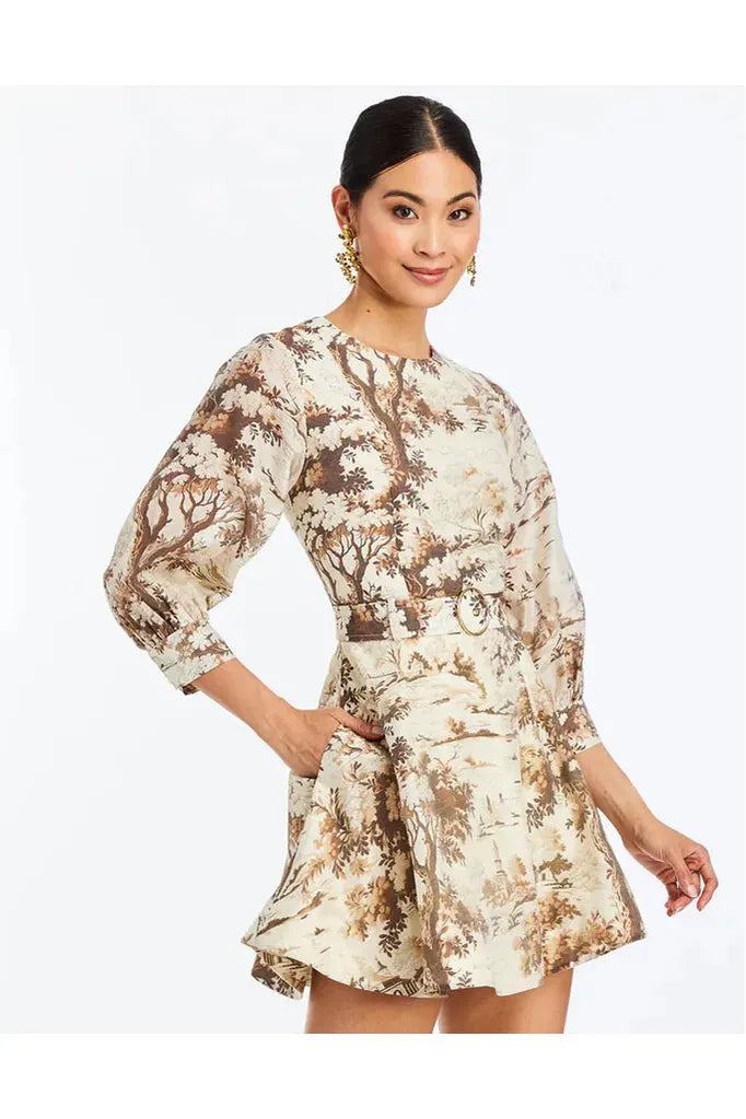 Embrace a gentle rustle of warmth with this Long Sleeve Maxi Dress. Its high neckline elegantly frames the face, while the flowing silhouette cascades in soft tiers, evoking whispered breezes. The rich macaw-inspired print blends earthy creams, ochres, and subtle blues, bringing playful vibrancy to every movement. Delicate puffed sleeves gather softly at the wrists, adding romance and charm to this enchanting maxi dress. By Farm Rio. Pair with your favorite Carrie Dunham bag and cover.