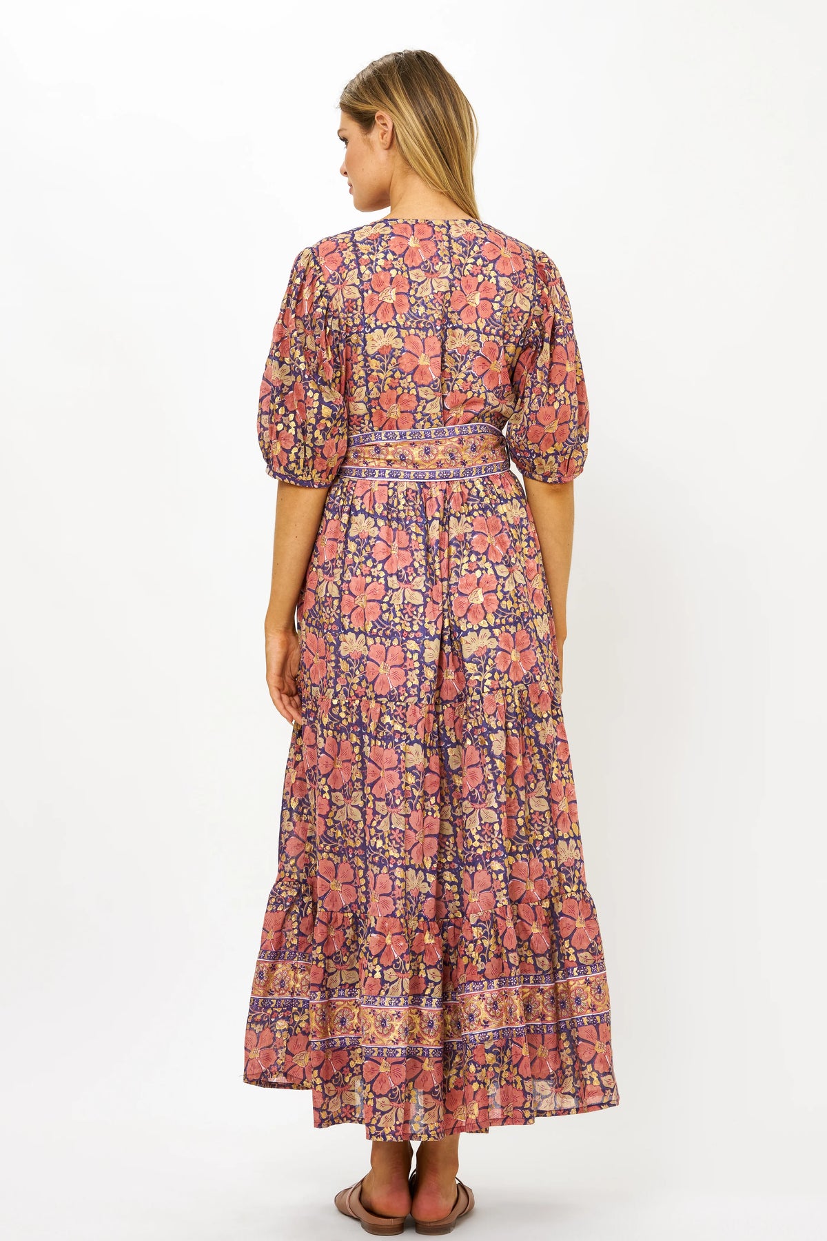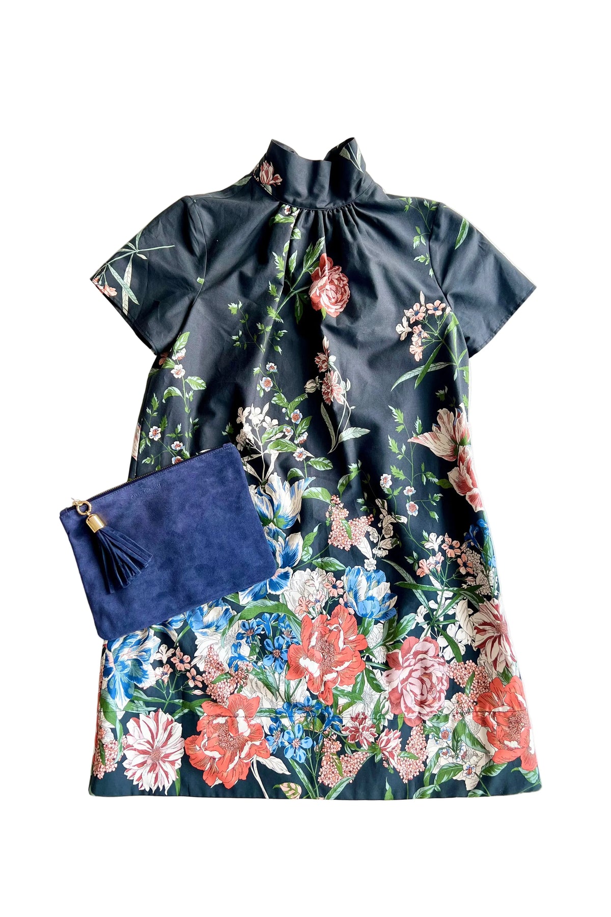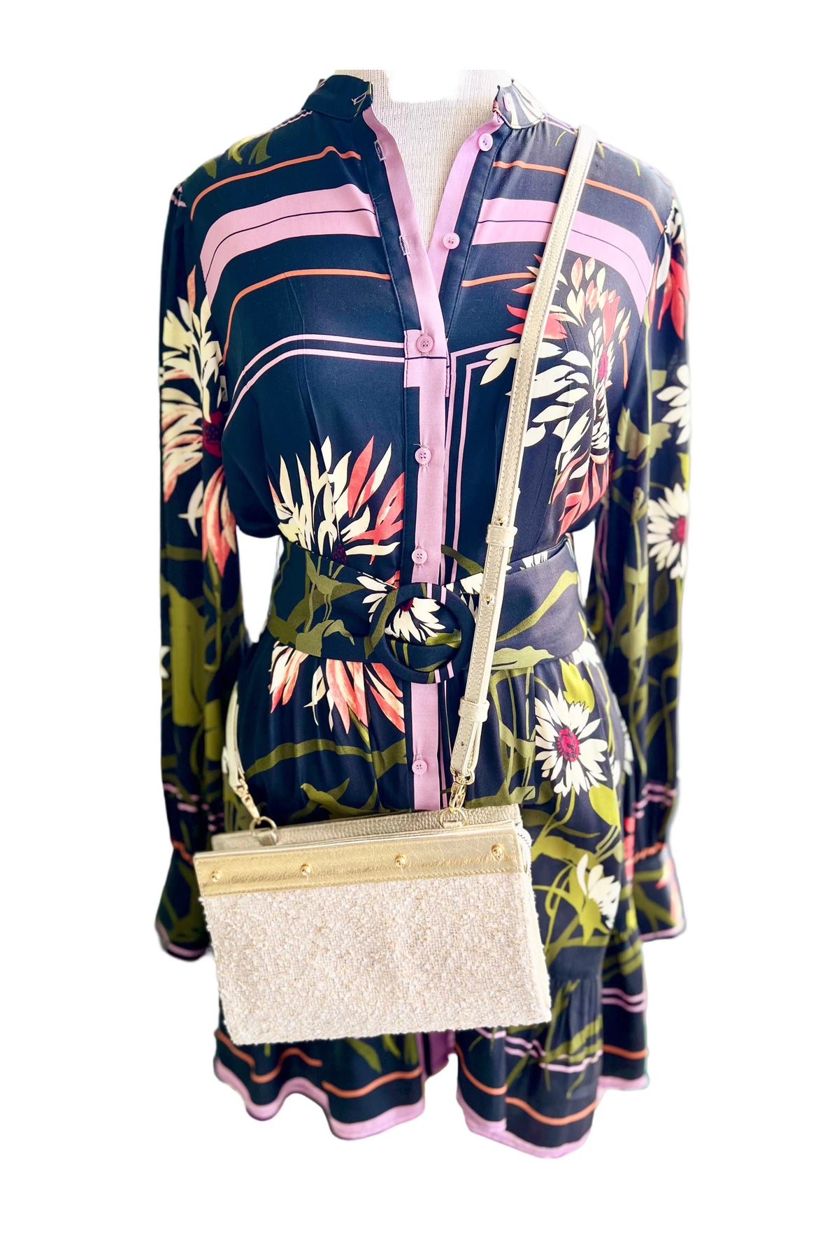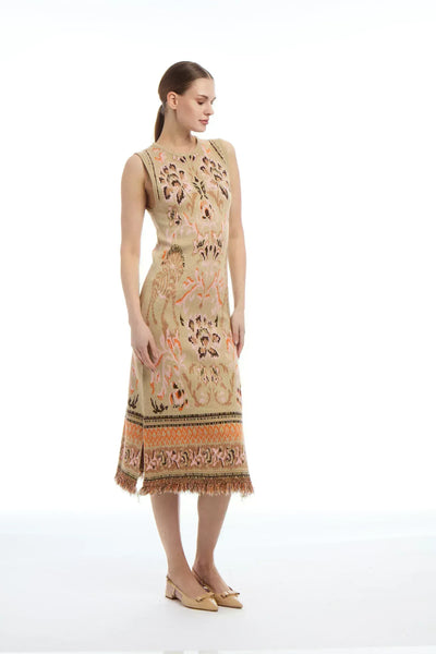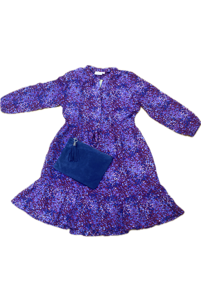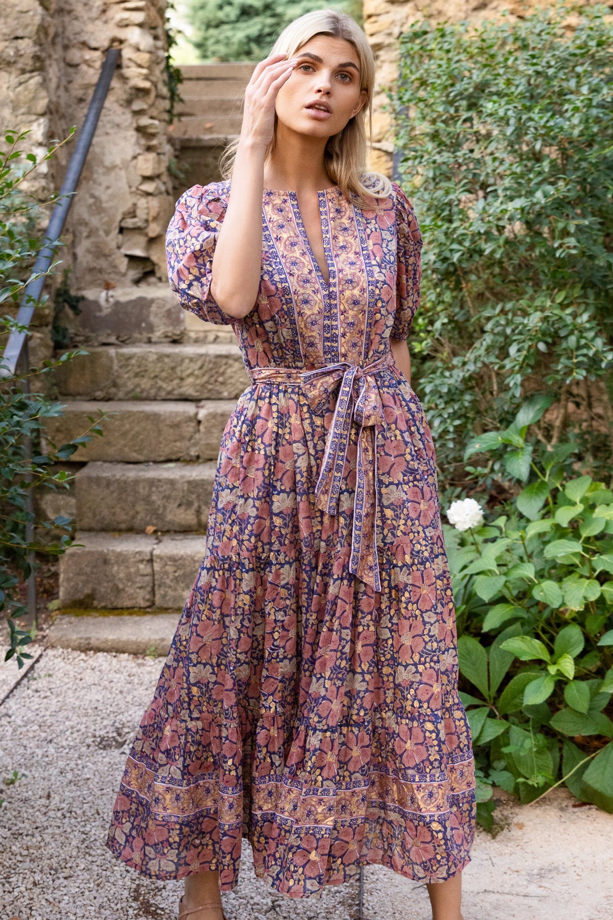 Embrace a gentle rustle of warmth with this Long Sleeve Maxi Dress. Its high neckline elegantly frames the face, while the flowing silhouette cascades in soft tiers, evoking whispered breezes. The rich macaw-inspired print blends earthy creams, ochres, and subtle blues, bringing playful vibrancy to every movement. Delicate puffed sleeves gather softly at the wrists, adding romance and charm to this enchanting maxi dress. By Farm Rio. Pair with your favorite Carrie Dunham bag and cover.