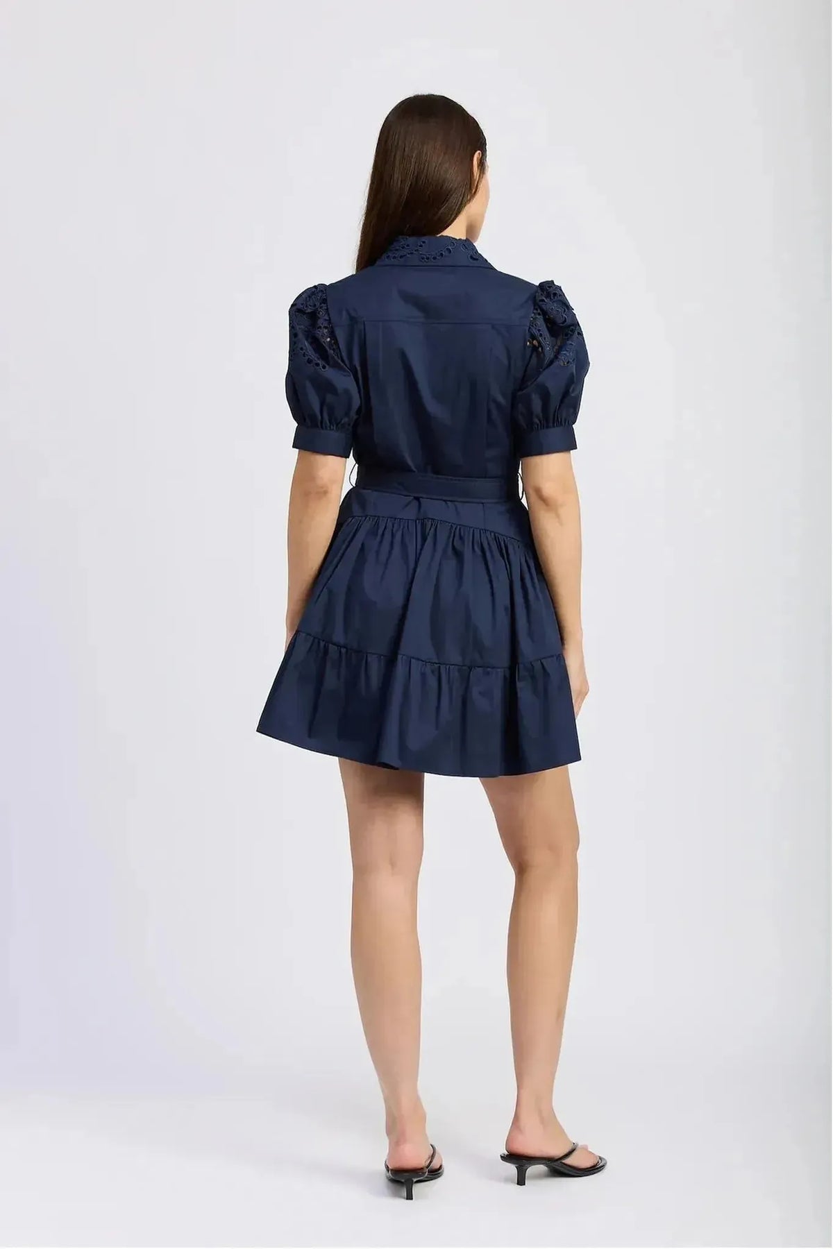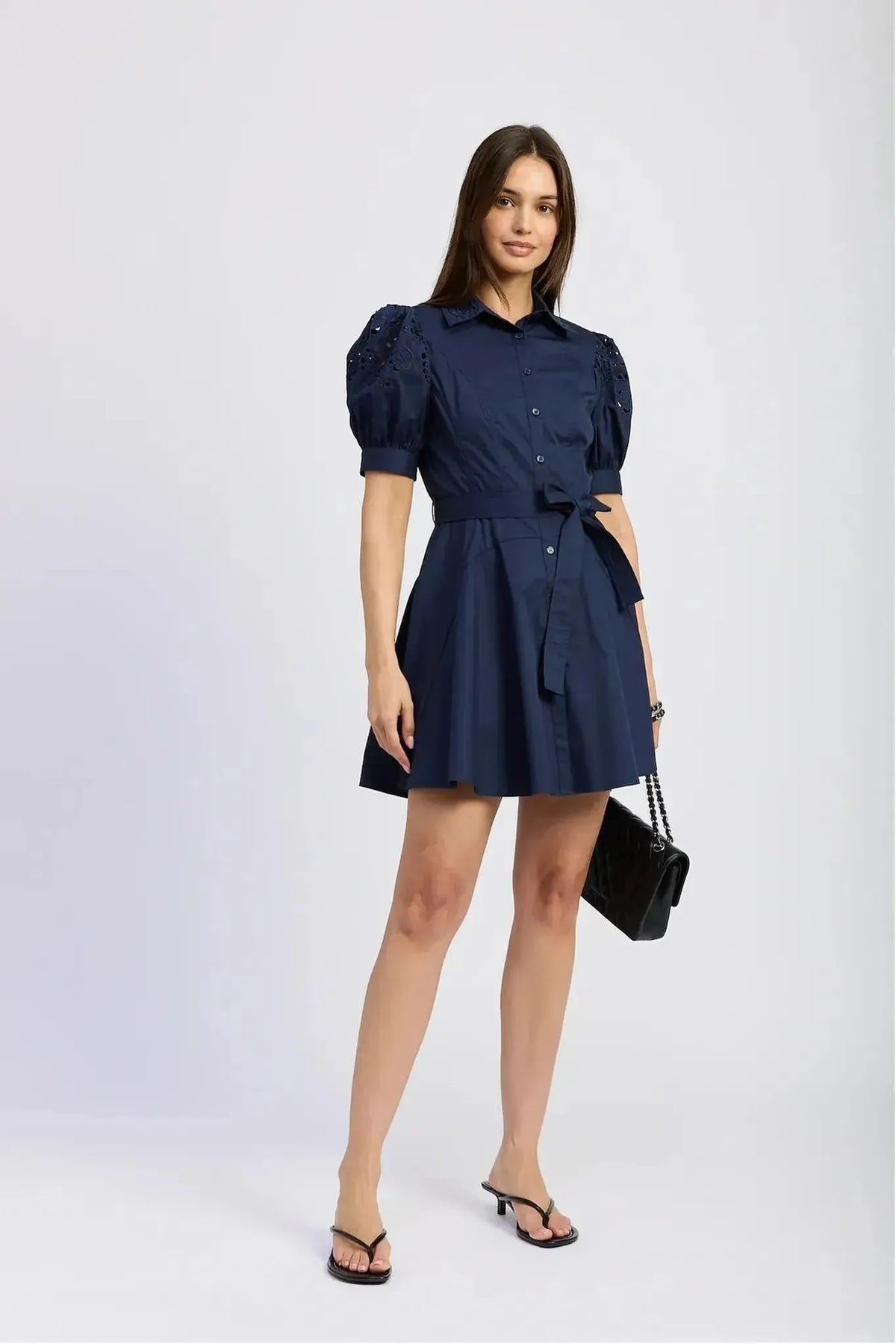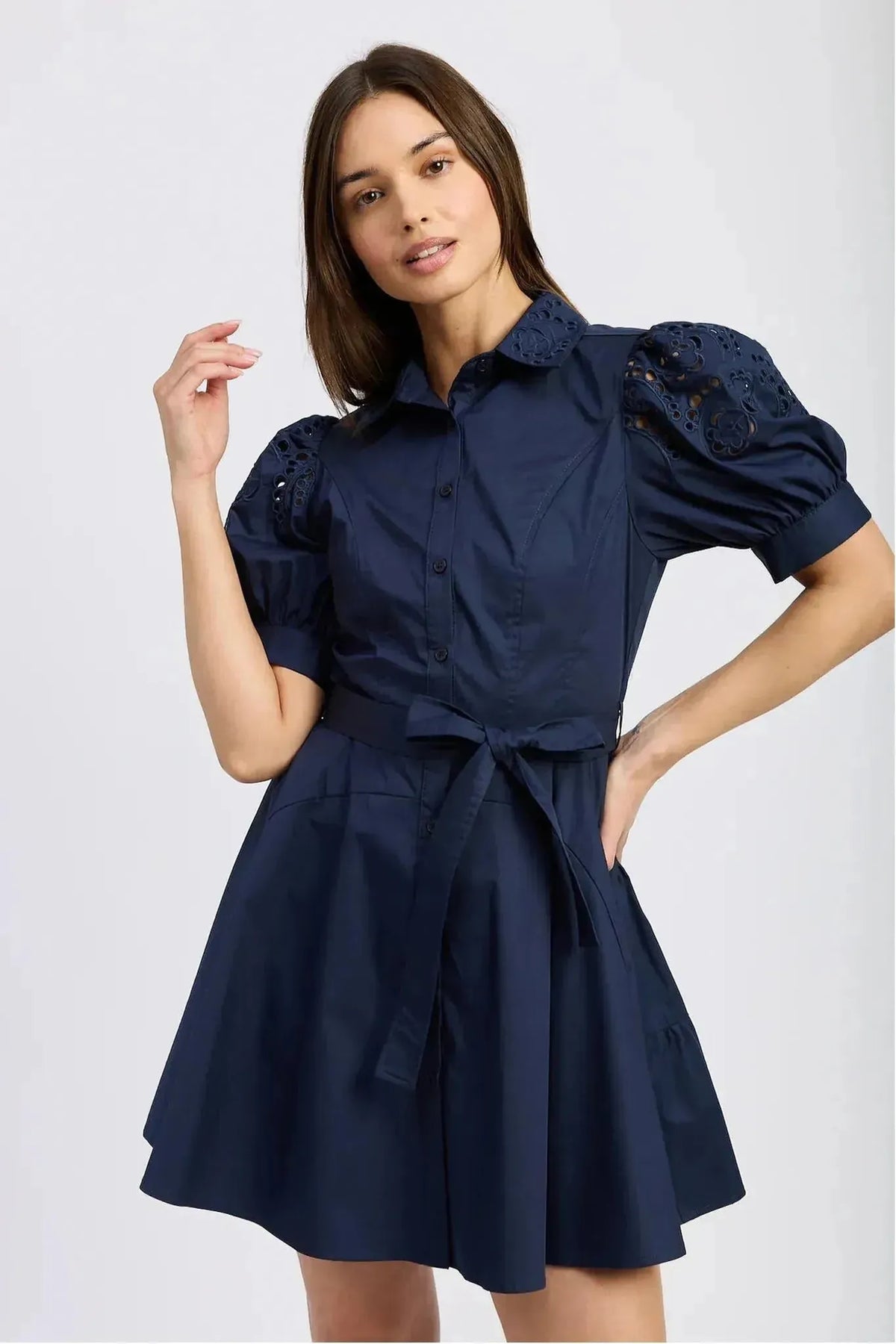 Introducing this new favorite dress! This go anywhere, button front silhouette features a covered placket, puff sleeves, and a sash belt. We love it in this timeless navy and white daisy print, finished with decorative embroidery trim. By Elizabeth James. Pair it with your favorite Carrie Dunham bag and cover!