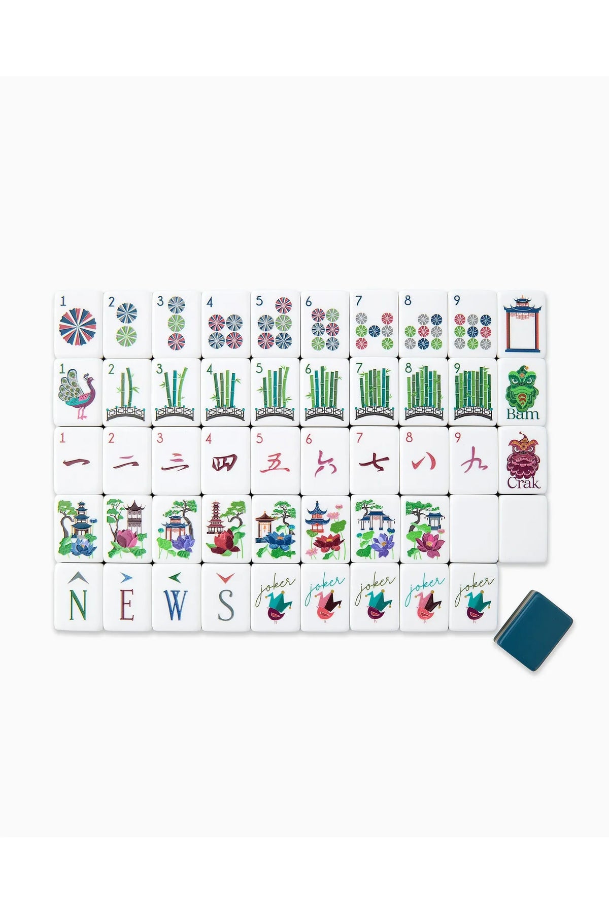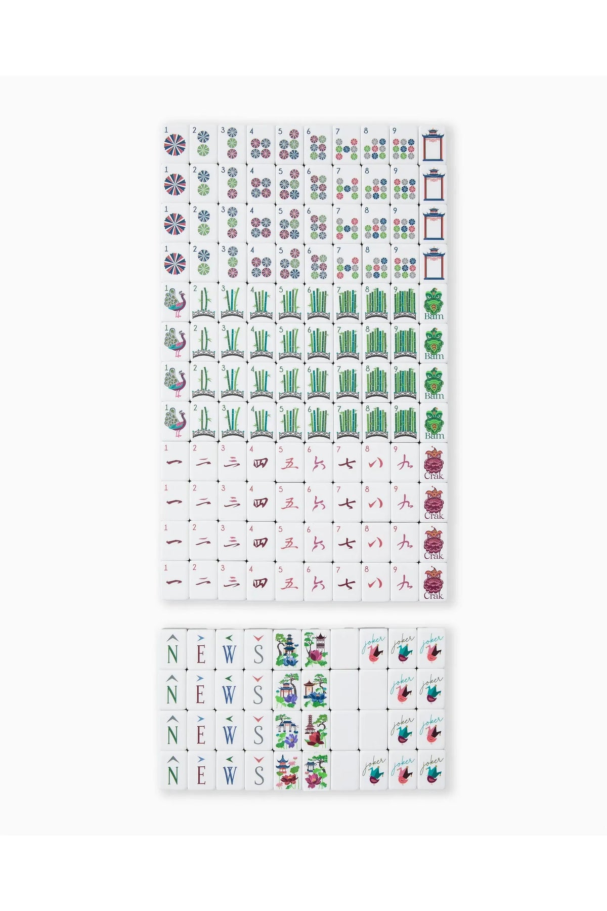 What's included: Tiles, a Dice/Coin Bag, and 4 Instructional Cards (you must purchase the NMJL Playing Card separately if you play American Mahjong).