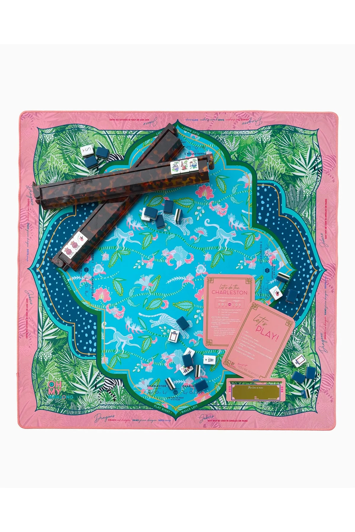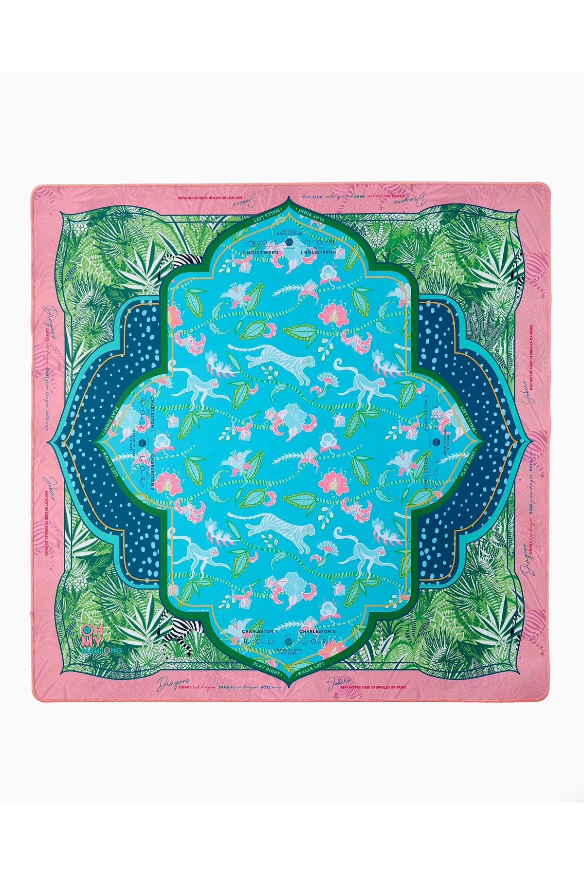 Go wild for this Mat, a stunning collaboration with Fort Worth-based fashion designer Sheridan French. Inspired by the jungle's playful spirit and rich beauty, this mat features a lush palette of aqua, coral, and tropical greens, brought to life with cheeky monkeys, striped zebras, and vivid jungle foliage. Designed to pair beautifully with the Glow Wild Tiles (but versatile enough to match many of the sets), the Serengeti Mat brings a sense of adventure, color, and charm to every game. The mat comes rolled in a canvas drawstring bag.