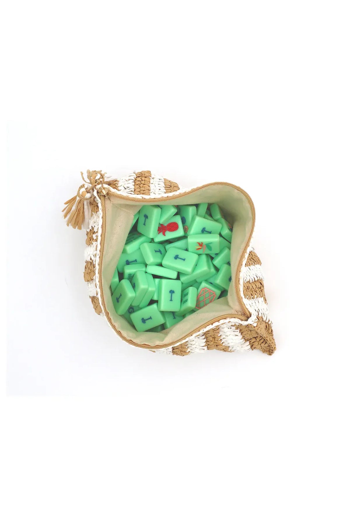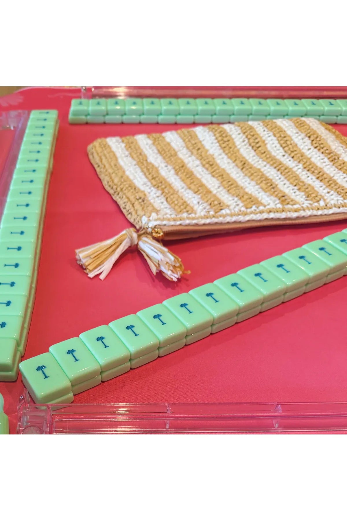 This white and natural striped raffia bag is the perfect blend of style and functionality. Designed to hold your mahjong tiles, this chic bag doubles as an everyday purse, bringing a touch of island-inspired elegance wherever you go. As part of an Island Collection, it’s perfect for packing your game essentials, whether you’re off on a tropical getaway or heading to a neighbor’s game night!