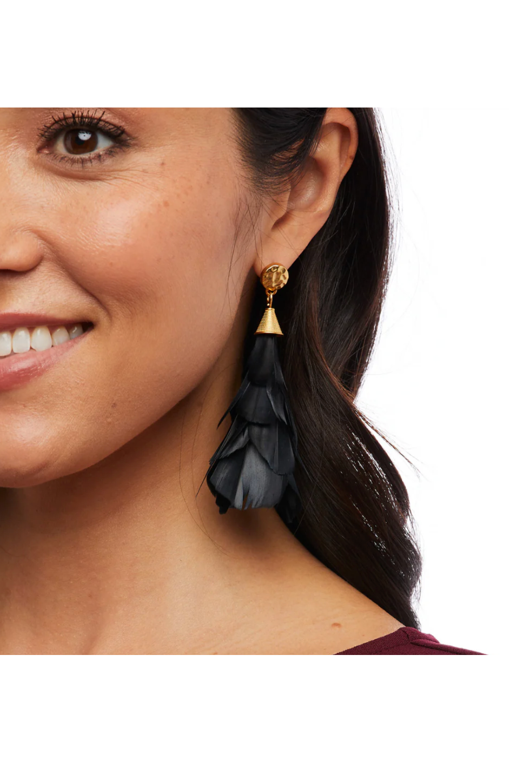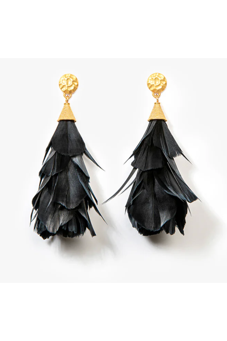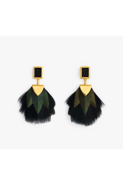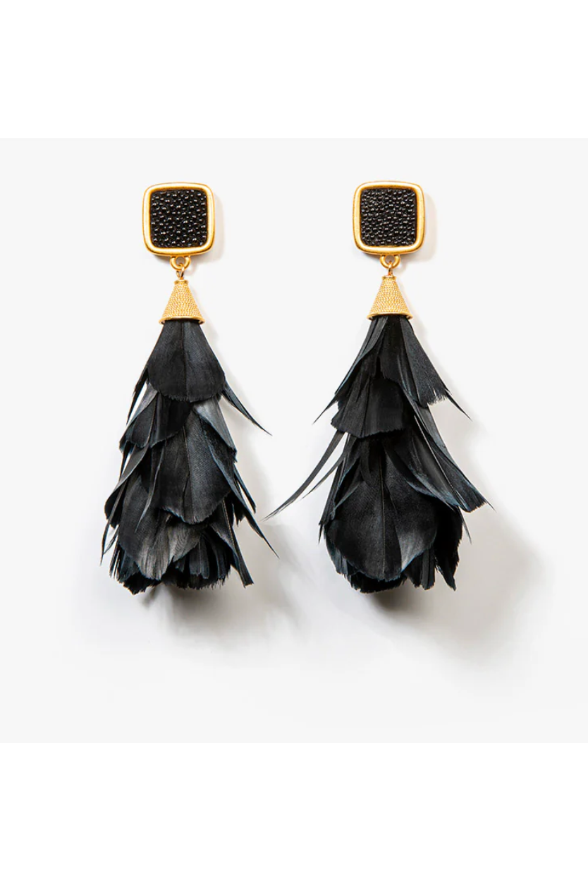 These are black goose feather earrings that are sleek and sophisticated. These formal black earrings are offered with two stud options: solid gold or stingray leather inlaid.