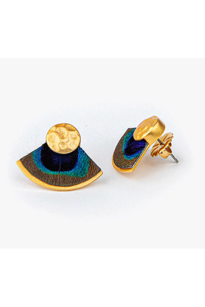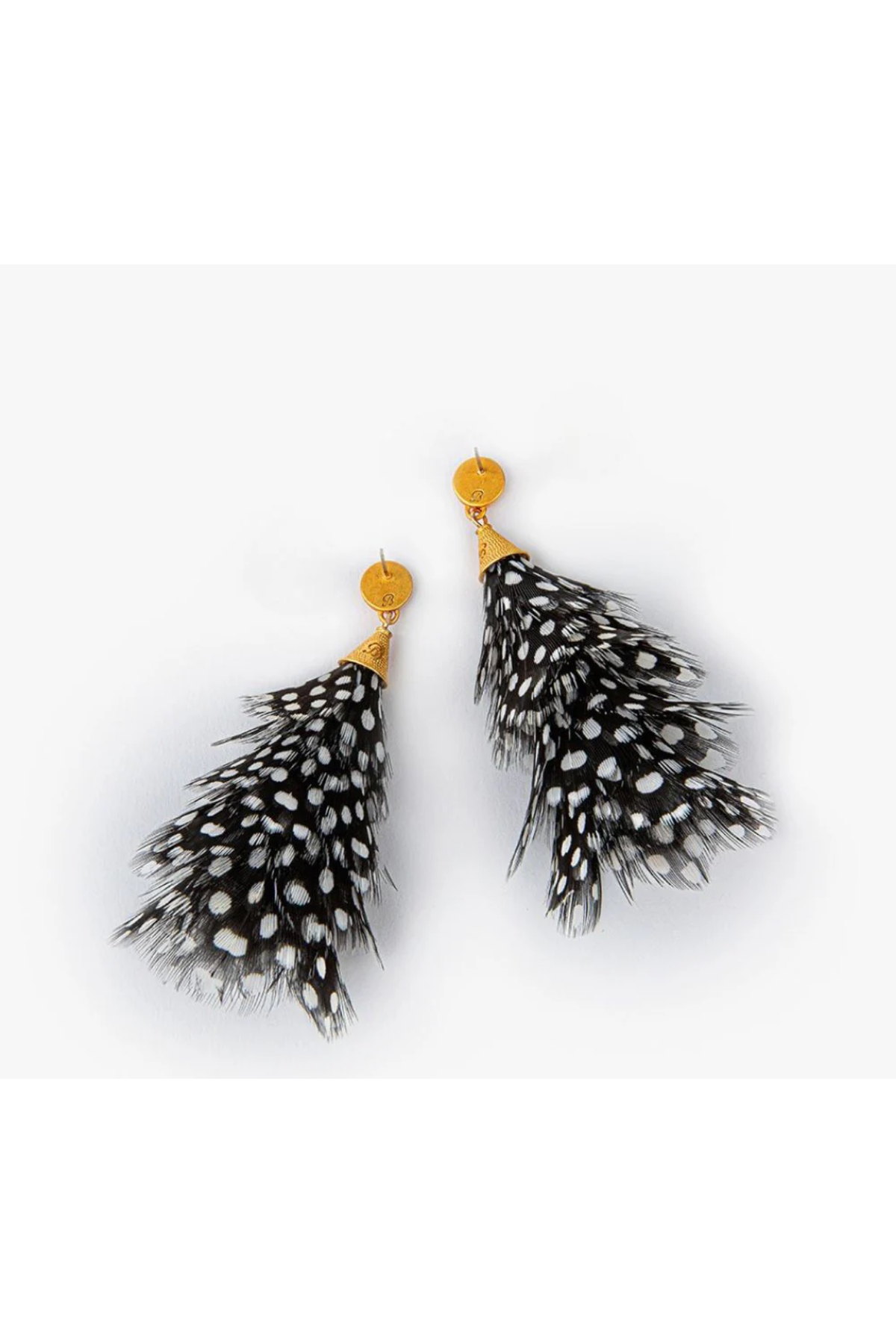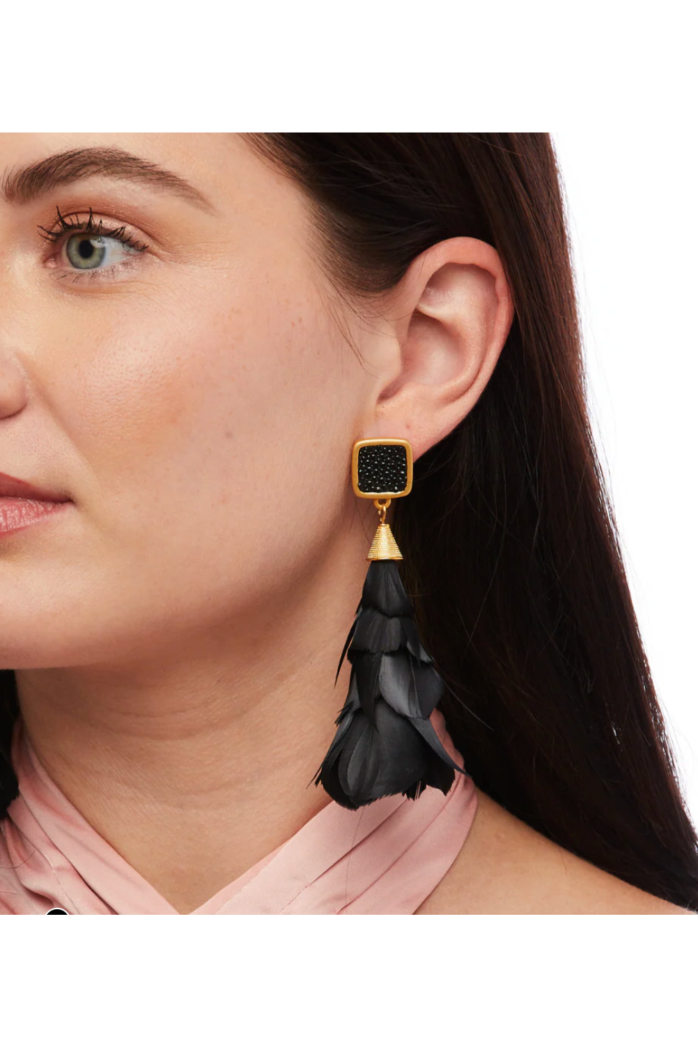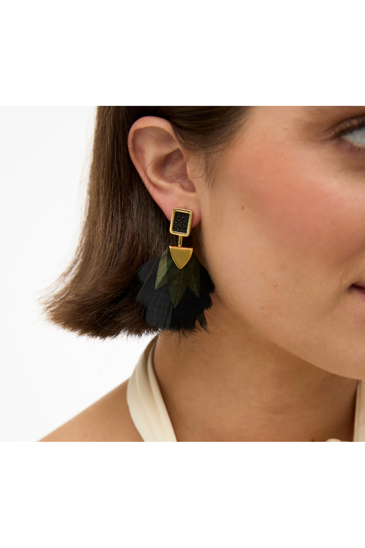 These are black goose feather earrings that are sleek and sophisticated. These formal black earrings are offered with two stud options: solid gold or stingray leather inlaid.