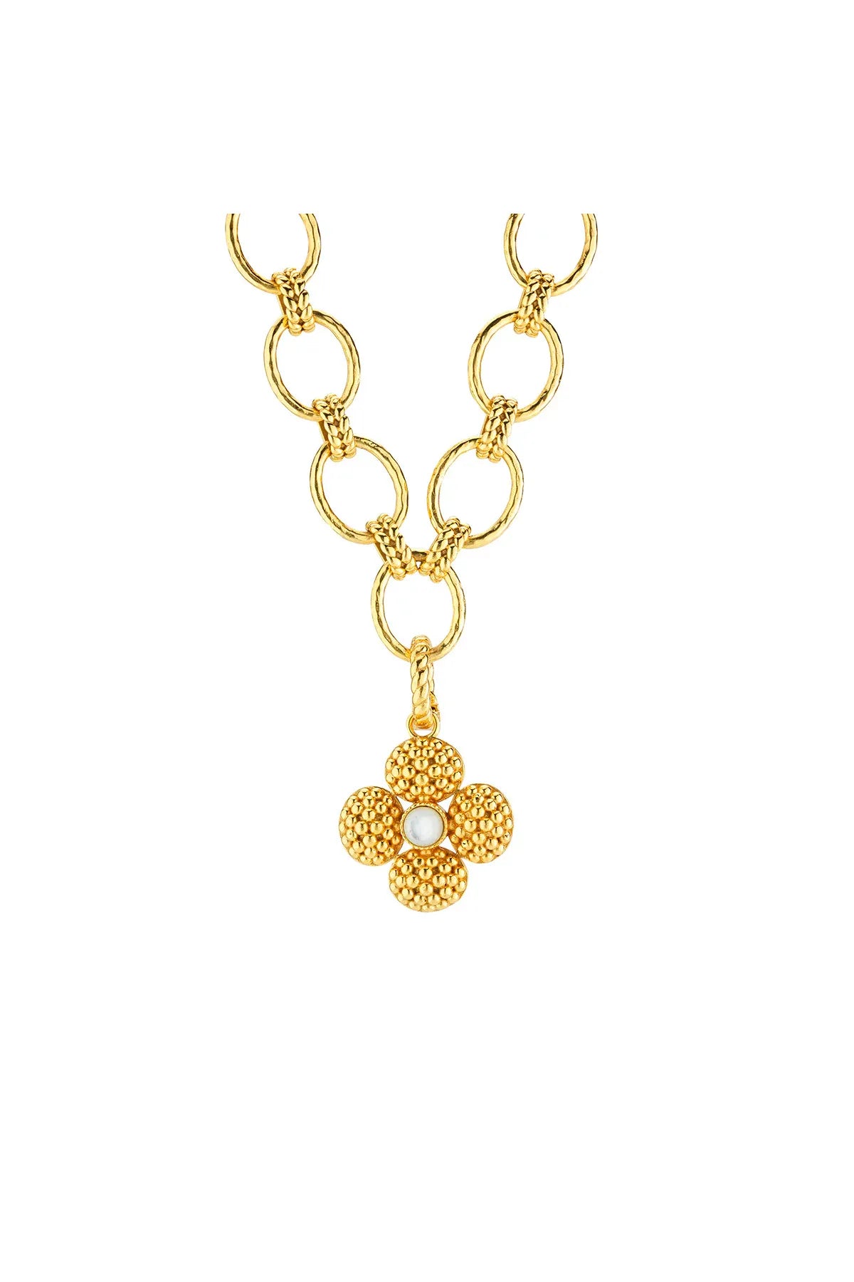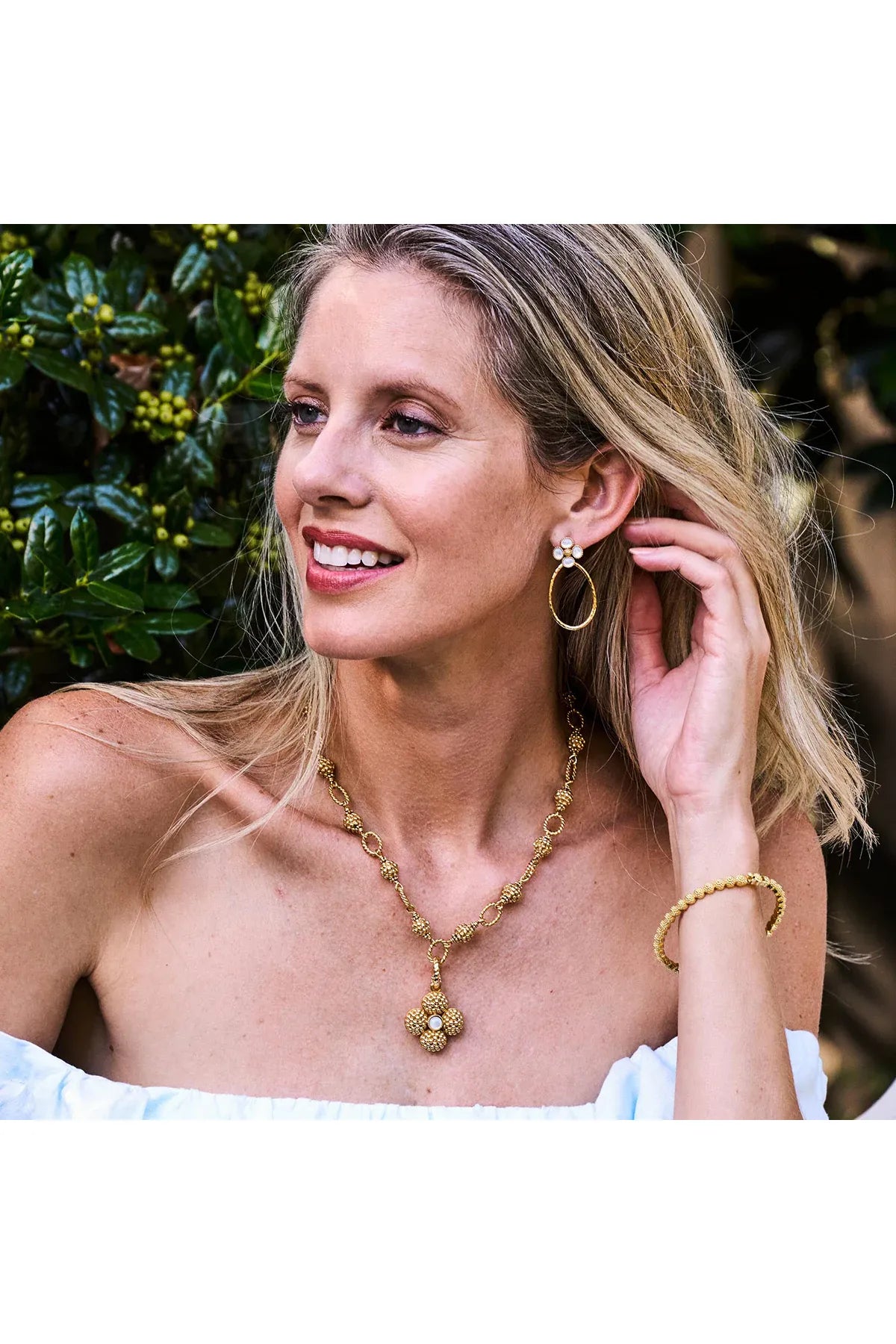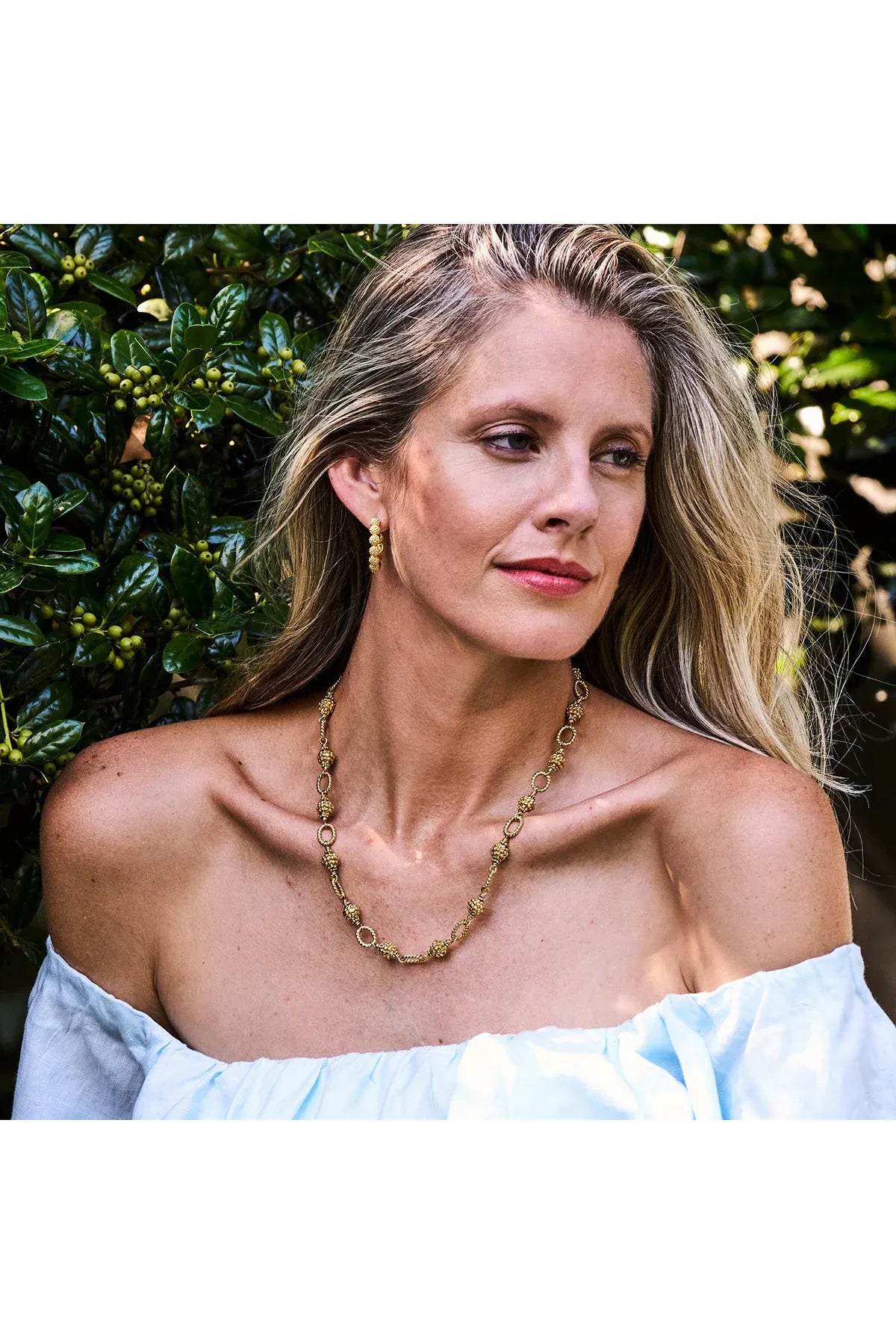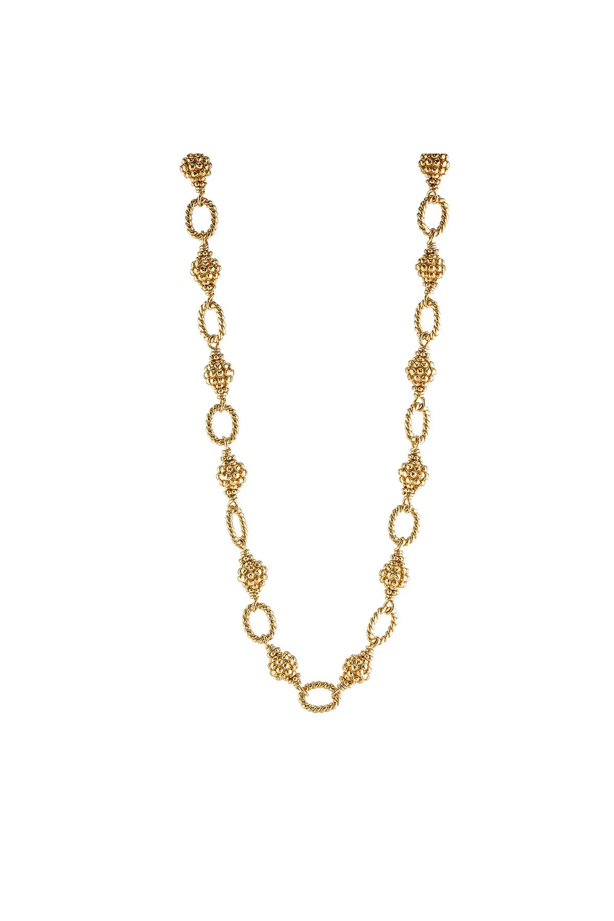 We’ve reimagined the classic necklace chain with some elevated elements—gorgeous golden berries interspersed with ornate links done in our iconic twisting thread. Gloriously versatile, this necklace moonlights as a bracelet when wrapped around the wrist three times or can be transformed into a lariat style. This piece is designed for layering and easily works with any pendant. Just like all women, this necklace can do it all while emanating beauty.