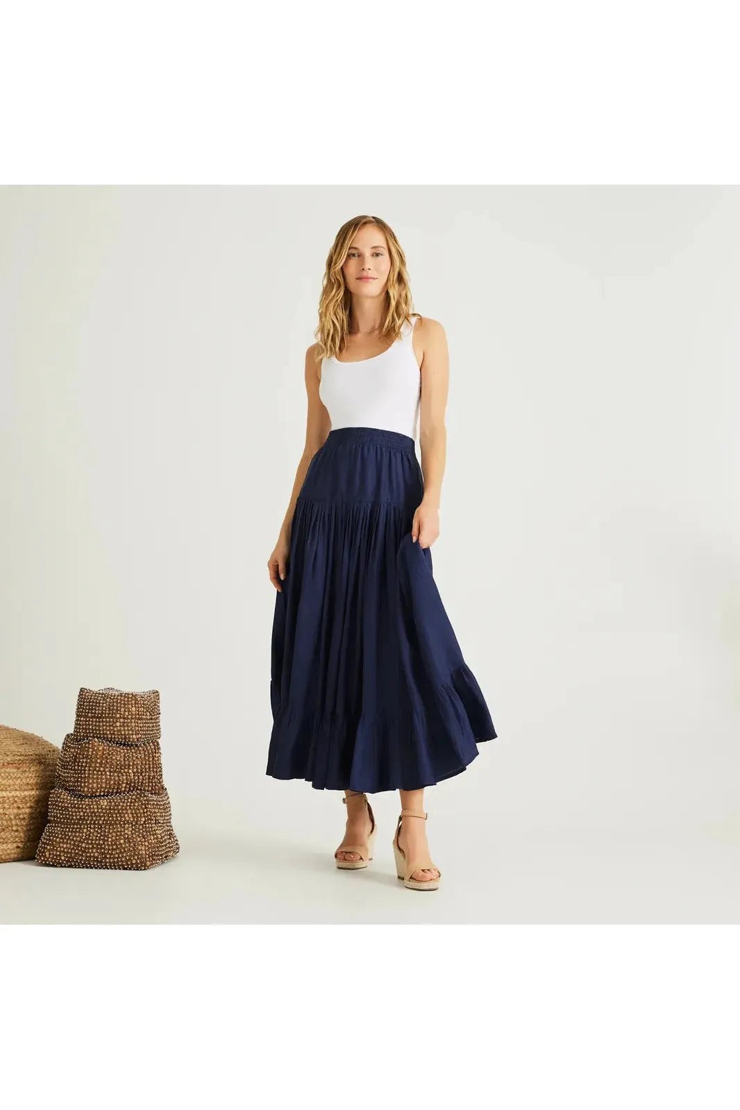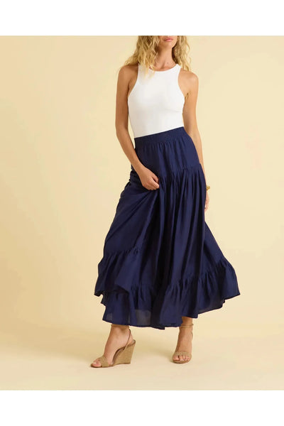 This skirt in a navy abstract print is a timeless full-length skirt with elegant volume and everyday versatility. Designed with a fitted banded waist and a back zipper closure, it features a soft A-line flare and side pockets for function. Fully lined, this skirt brings both comfort and polish to your day-to-evening wardrobe. By Lusana. Add your favorite Carrie Dunham bag to finish the look!