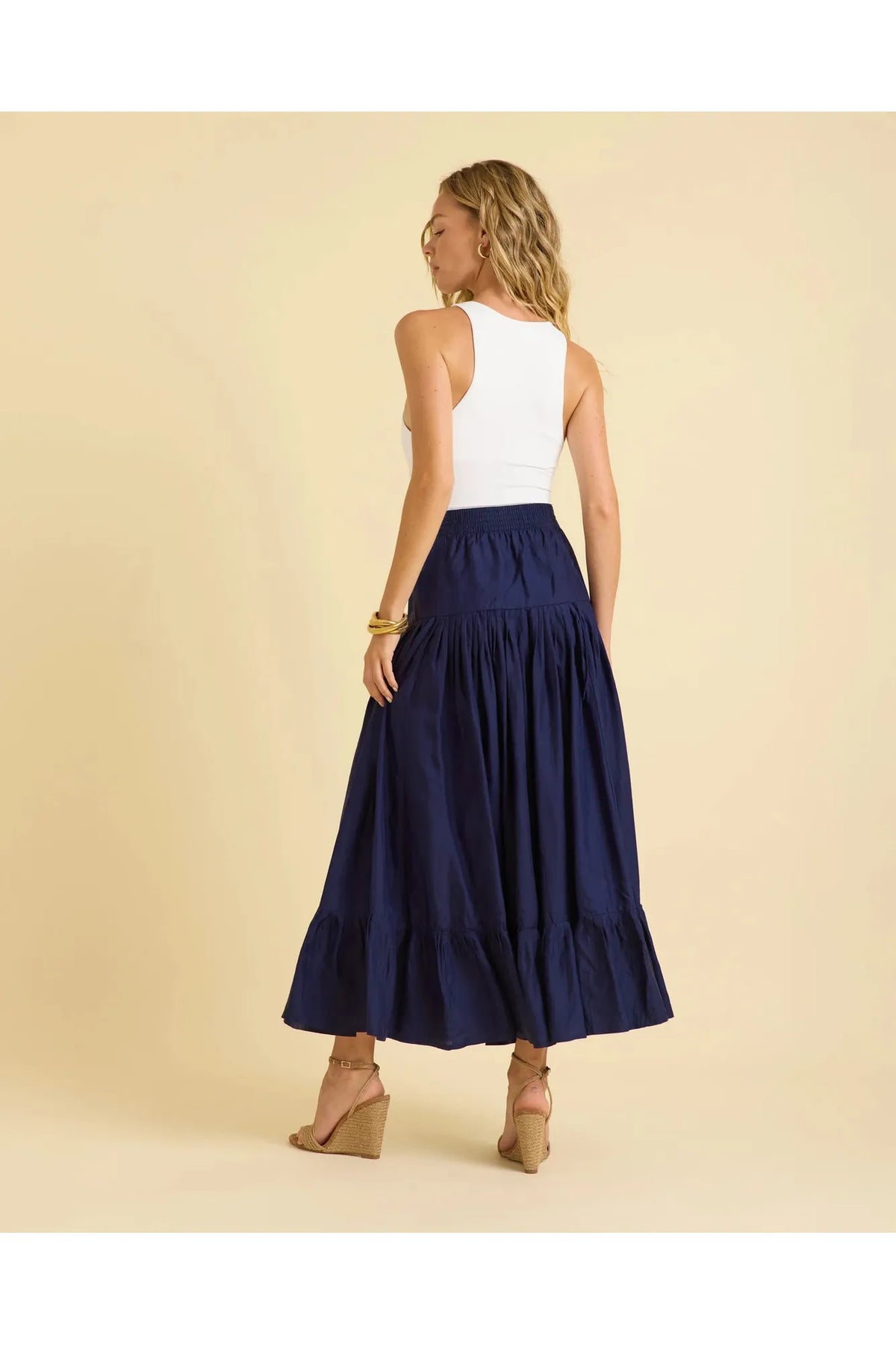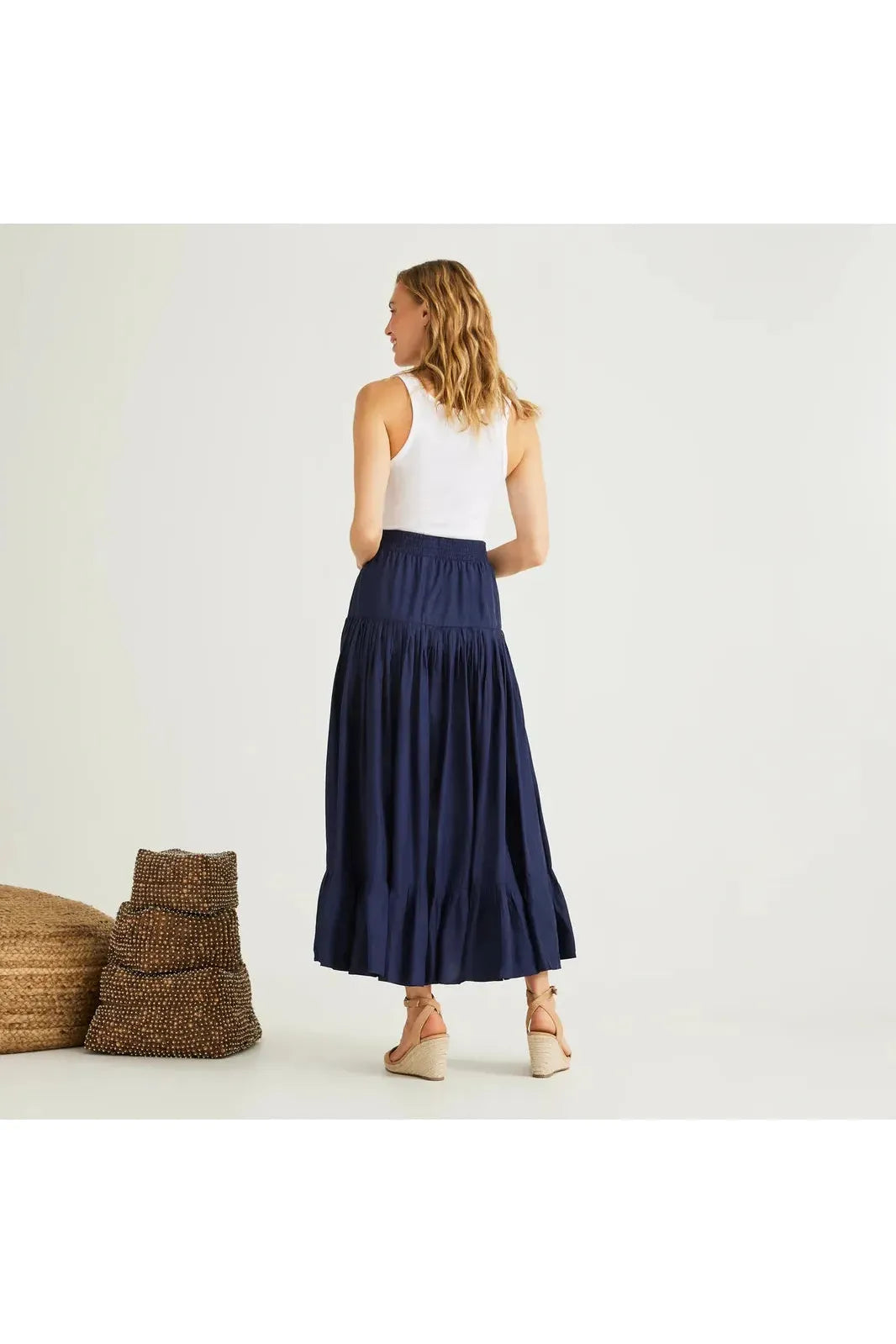 A buttery soft rayon tencel fabric hand blocked maxi skirt with high low hem and smocked waist. By Bell by Alicia Bell. Pair it with your favorite Carrie Dunham bag.