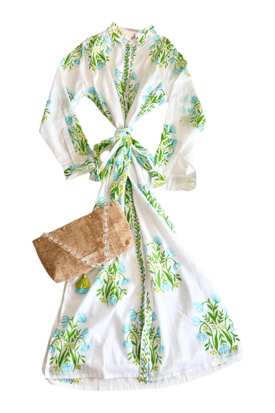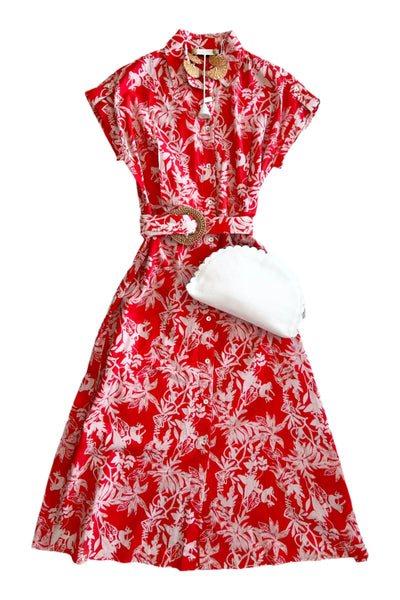 This will be your constant companion this summer. It can go everywhere in crisp cotton poplin and a unique batik print, with adjustable tie neck and an optional belt when you feel like it. By Calypso St. Barth. Pair with your favorite Carrie Dunham bag!