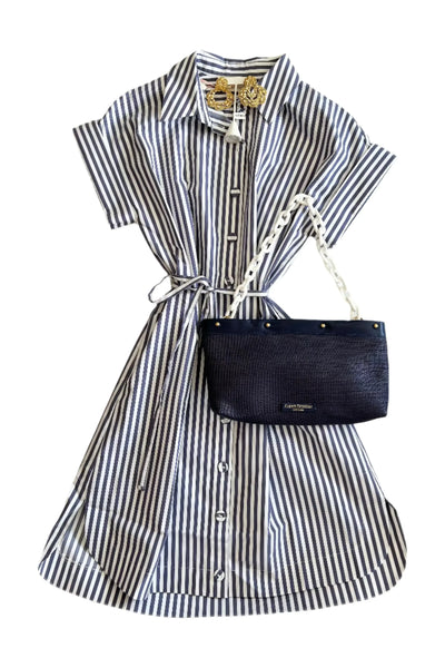 This Dress exudes timeless sophistication with stripes and a belted waist. Designed with elegance and ease in mind, this mini dress features structured tailoring with feminine details, making it a wardrobe staple for both daytime refinement and evening poise. Pair with your favorite Carrie Dunham bag!