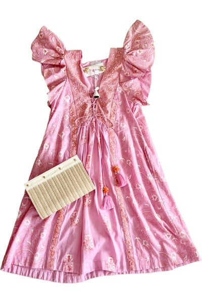 Silk cotton voile hand blocked top with ruffle cap sleeves and hand made tassel tie neckline. By Bell by Alicia Bell. Pair with your favorite Carrie Dunham bag for a complete look!