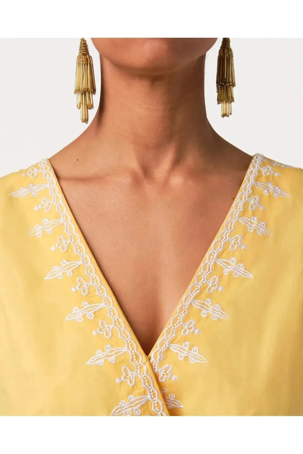 This is as fresh and sunny as your summer will be. In crisp, cotton poplin, a comfortable elastic waist, and touches like embroidery detail at neckline and delicate beaded tassel. By Calypso St. Barth. Pair with your favorite Carrie Dunham bag!