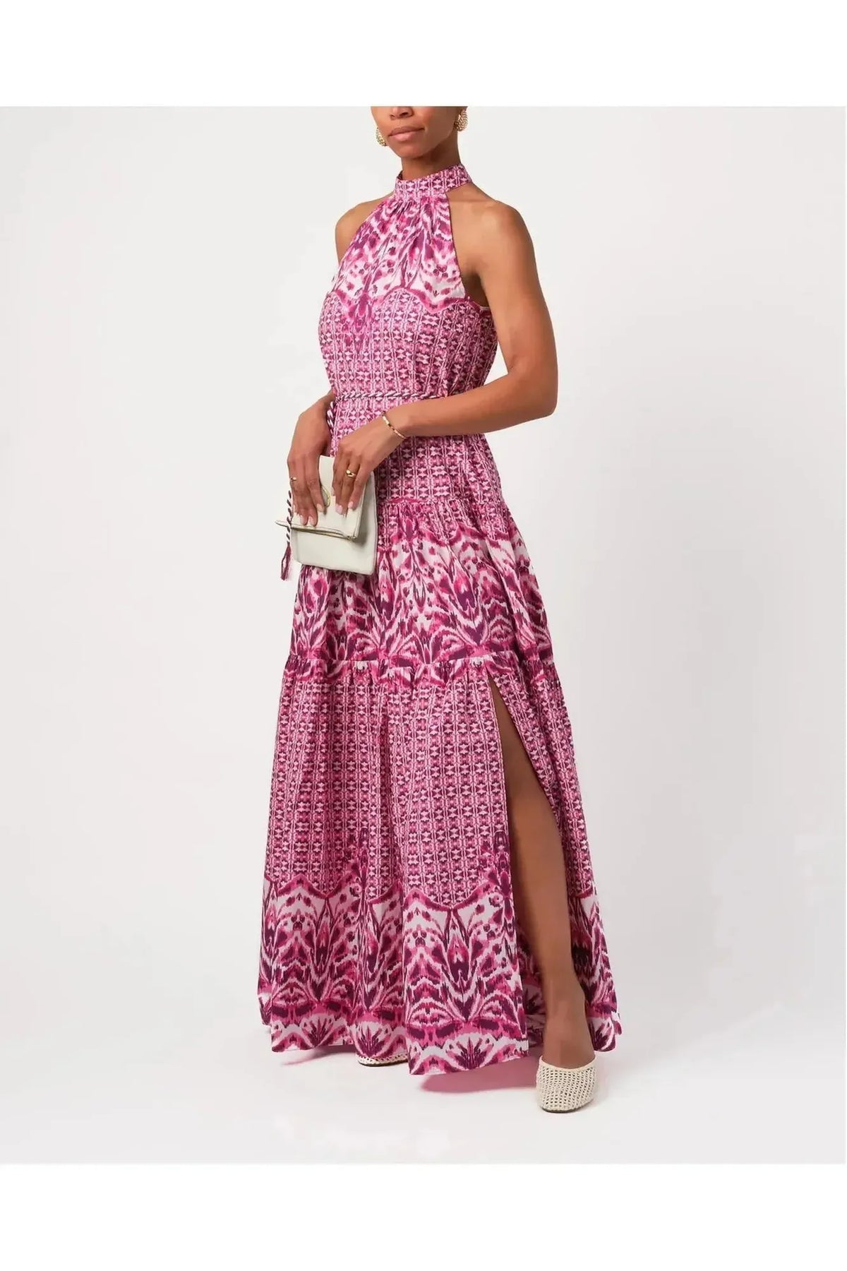 This Maxi is all about subtle impact. With a halter neck, plunging neckline, and clean silhouette, it walks the line between simple and striking. Add your favorite accessories for a personalized finish. This dress is perfect for a Spring or Summer event or wedding! By Amanda Uprichard. Pair it with a Carrie Dunham bag for a complete Spring or Summer outfit!