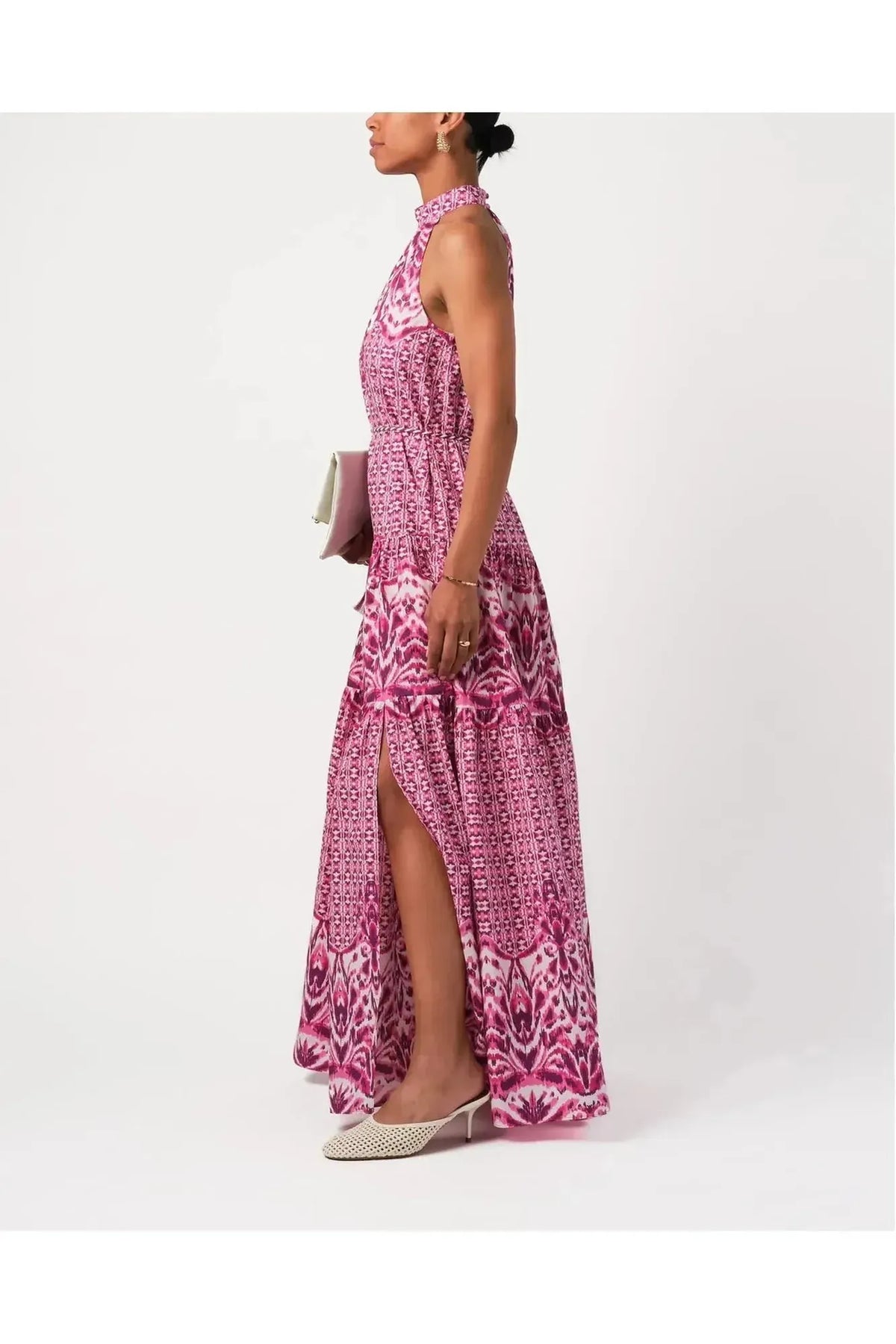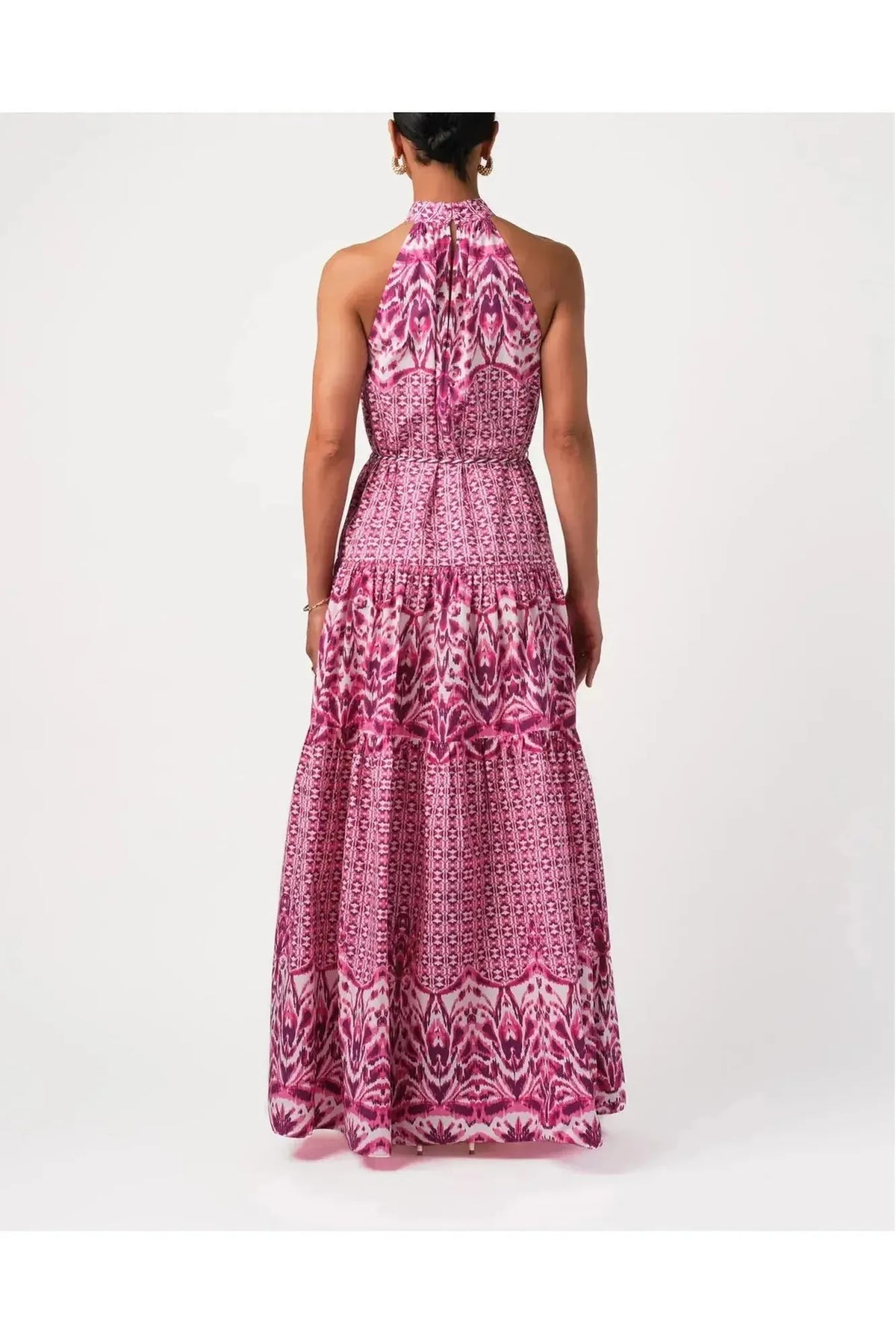 A buttery soft rayon tencel fabric hand blocked high neckline maxi dress with tassel ties at the neck. By Bell by Alicia Bell. Pair it with your favorite Carrie Dunham bag.