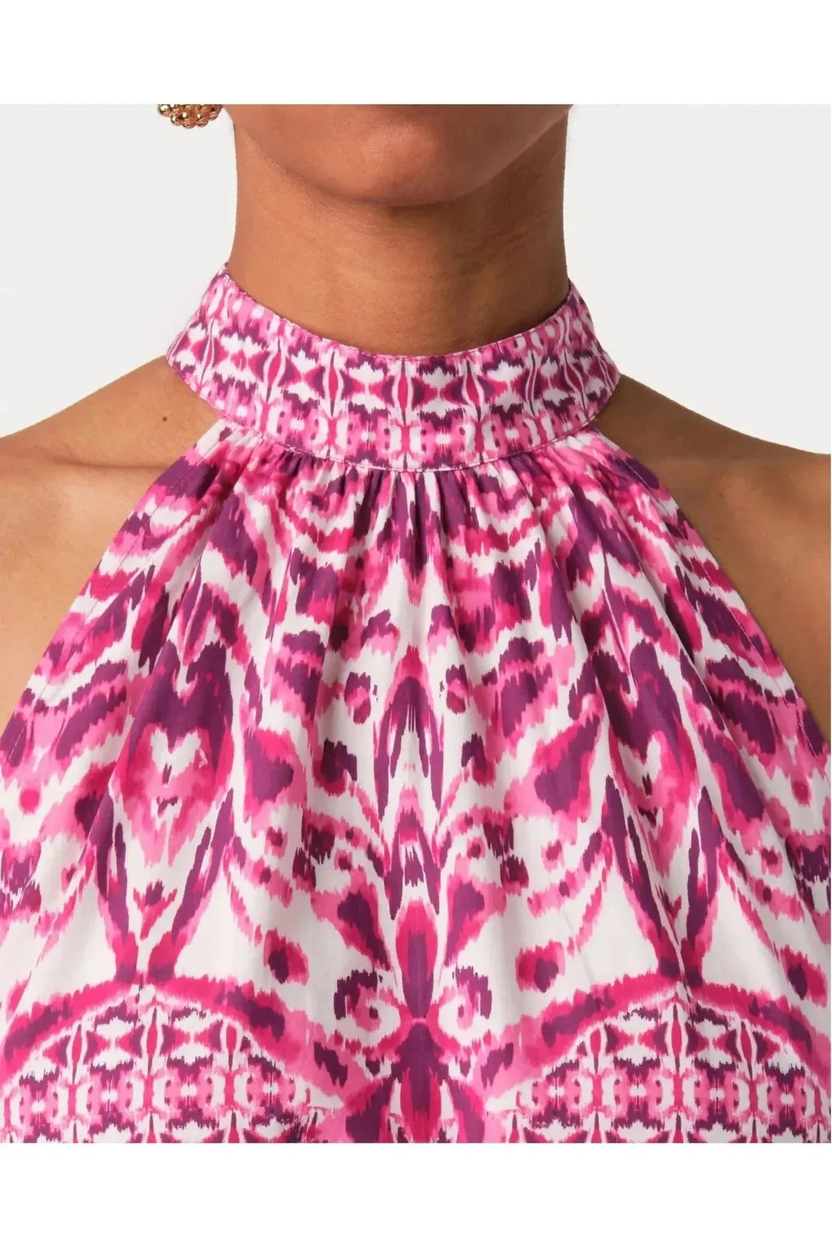 Silk cotton voile hand block printed ruffle halter top with bow detailing at waist. By Bell by Alicia Bell. Pair with your favorite Carrie Dunham bag for a complete look!