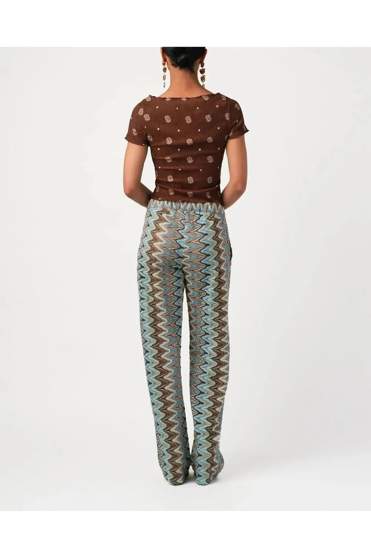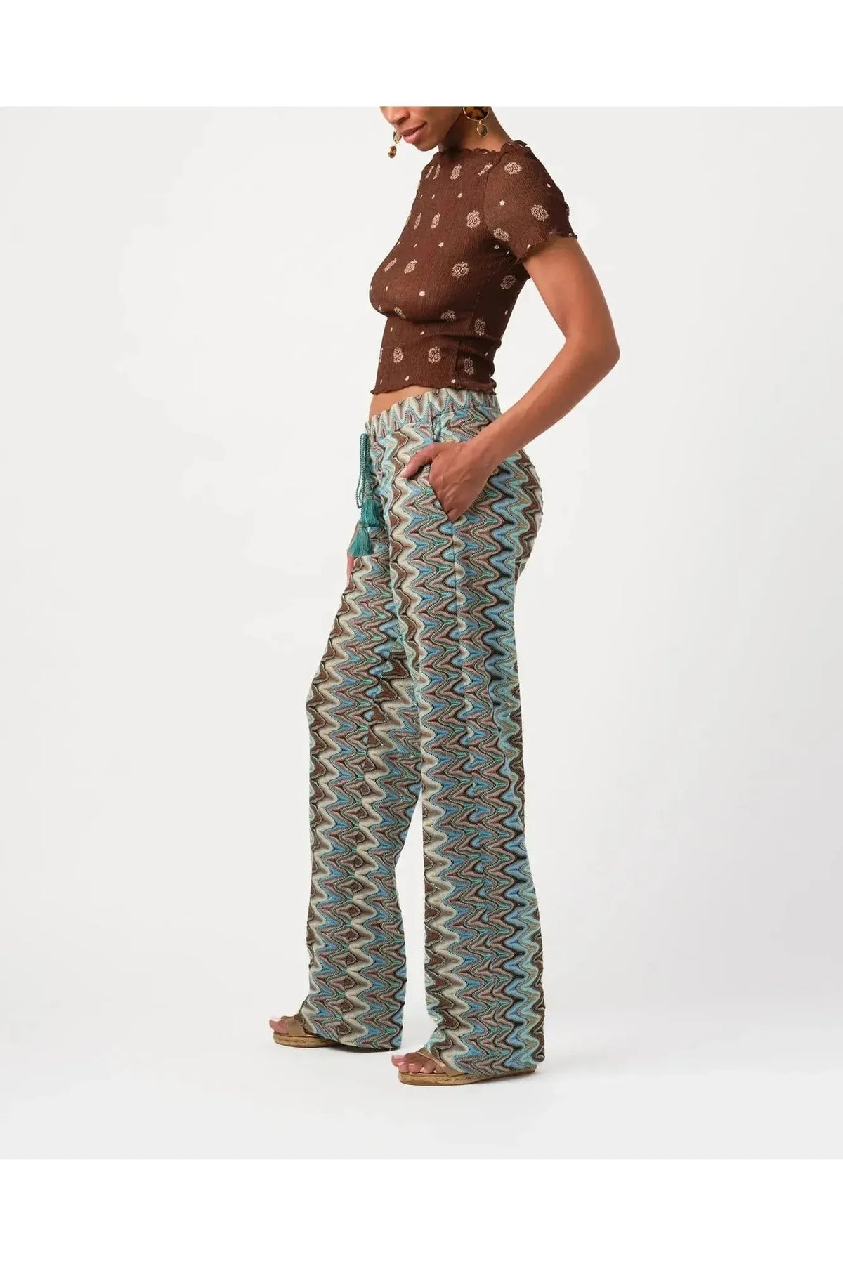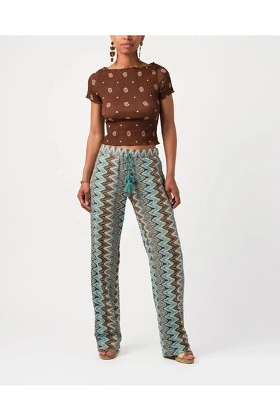 Relaxed but sophisticated, this pant is a soft, straight leg pant in zig zag knit. With side pockets and drawstring waist tie and tassels wrapped with delicate gold beads. Saunter to lunch with a white button down or pop on a sparkly top for anything your evening requires. By Calypso St. Barth. Pair with your favorite Carrie Dunham bag!