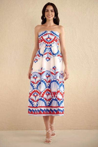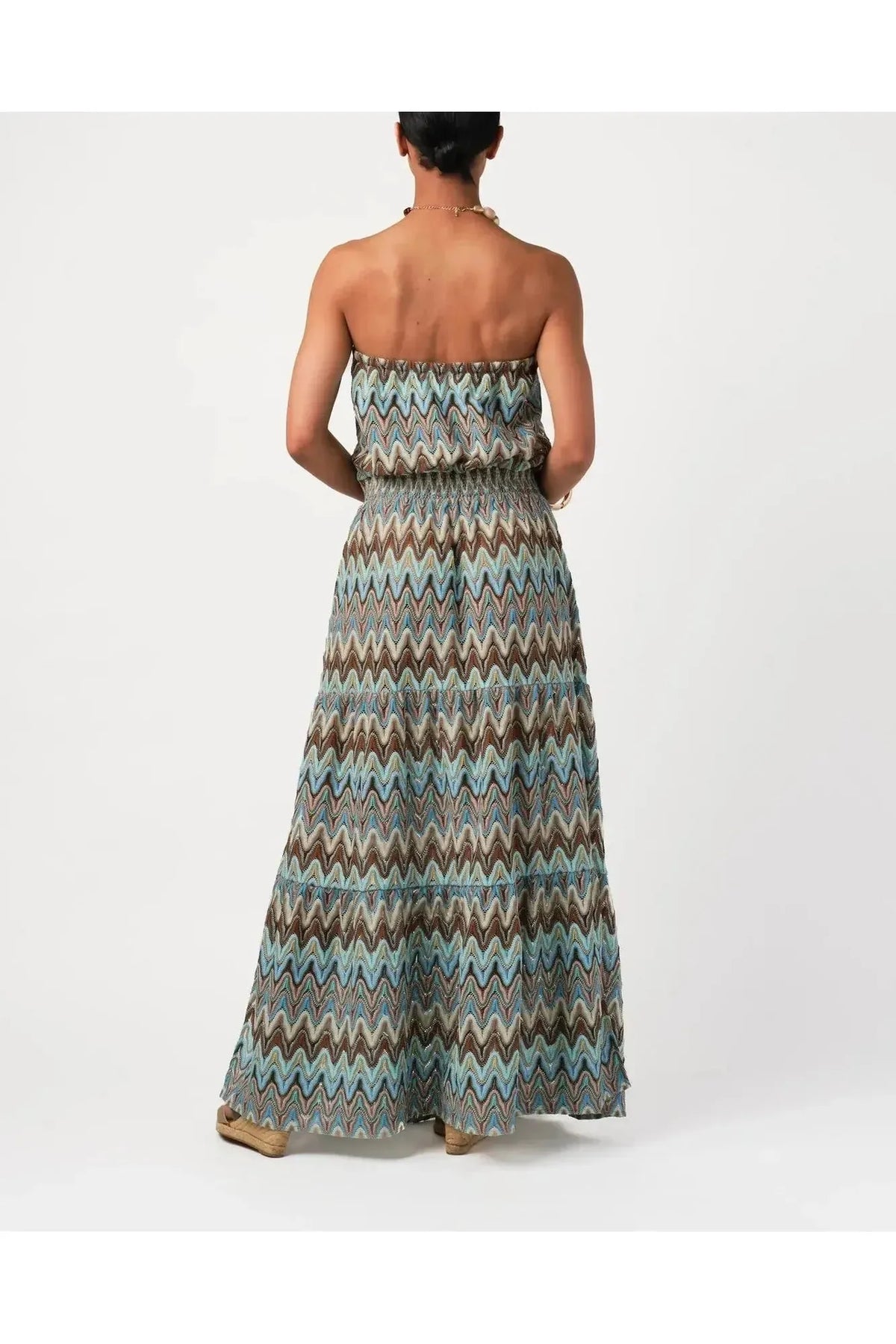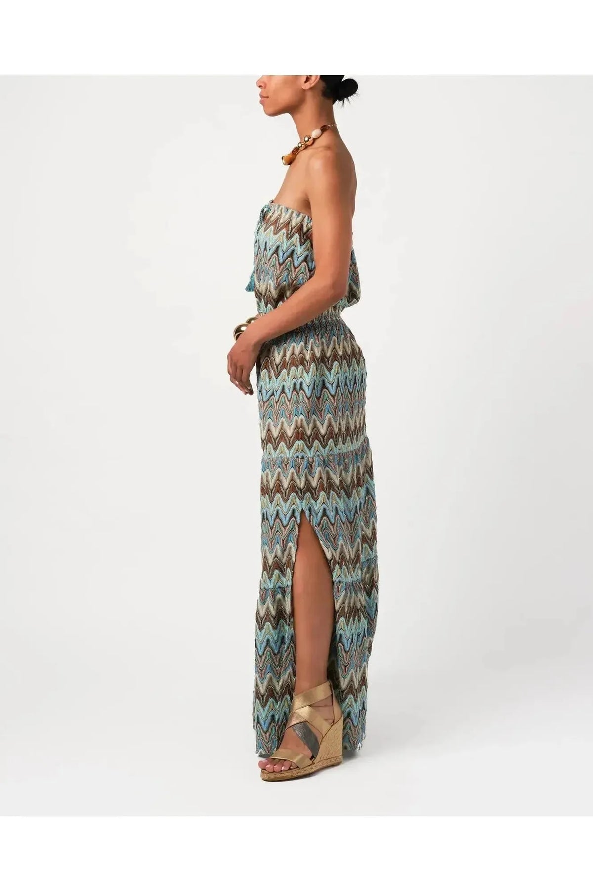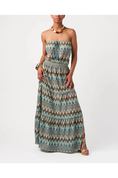 In a sophisticated zip-zag knit, this is a slim, strapless, pull on dress with side slits and generous bottom flounce for movement. Elastic waist with drawstring tie finished with pom-poms and gold beading wrap. By Calypso St. Barth. Pair with your favorite Carrie Dunham bag!