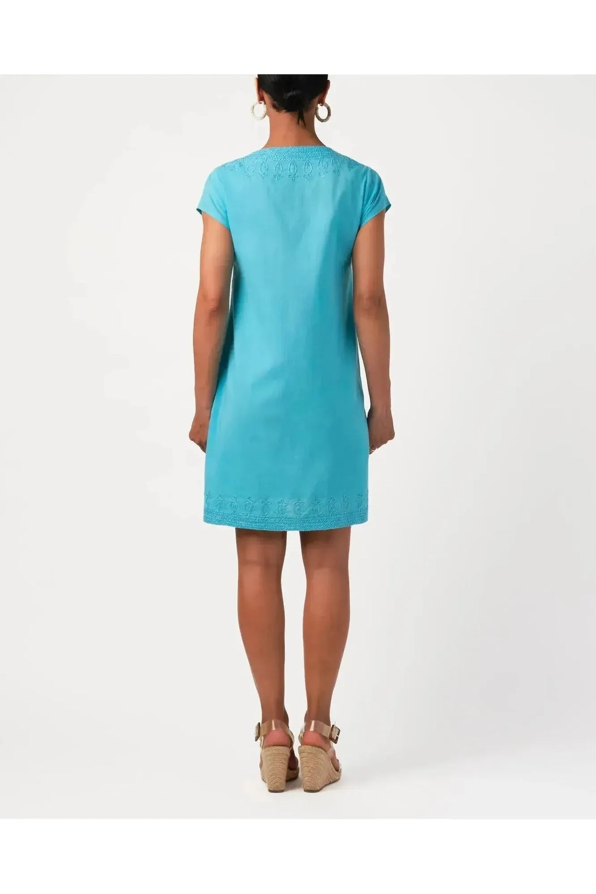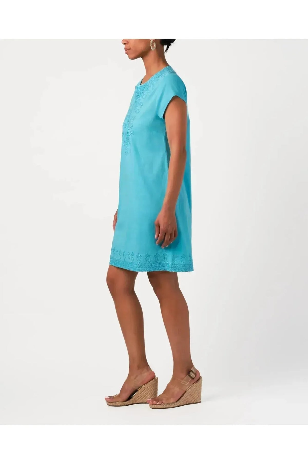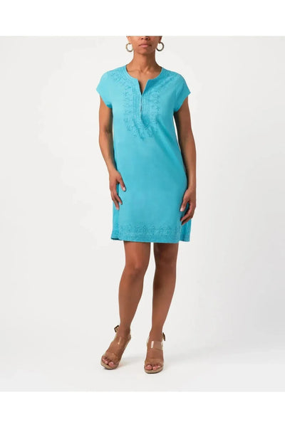 This best-selling, beloved shift dress is back. Crafted in fine cotton with intricate embroidery on the neckline. Breezy and easy, this will take you to the beach, lunch, and beyond. By Calypso St. Barth. Pair with your favorite Carrie Dunham bag!