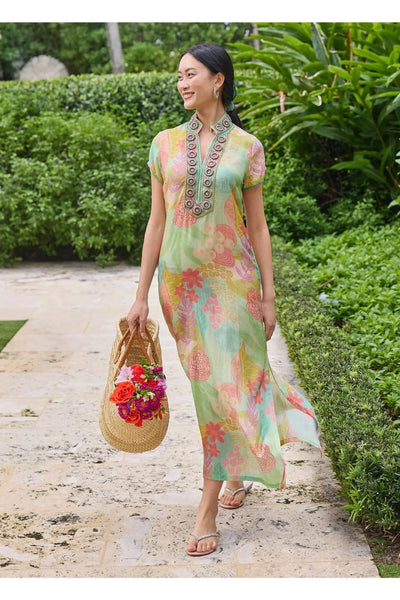 This Caftan serves up major poolside glam with shades of teal, grass green and ivory in silky viscose. The signature hand beading highlights the border at the neckline. Pair it with a strappy sandal for everything from seaside cocktails to entertaining at home. By Bella Tu. Pair with your favorite Carrie Dunham bag!