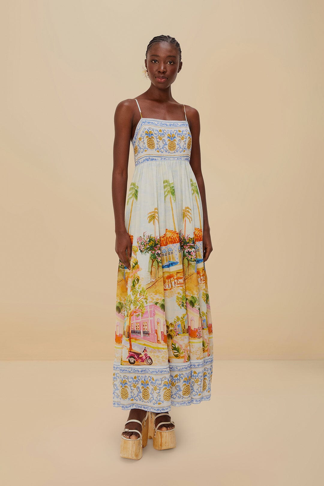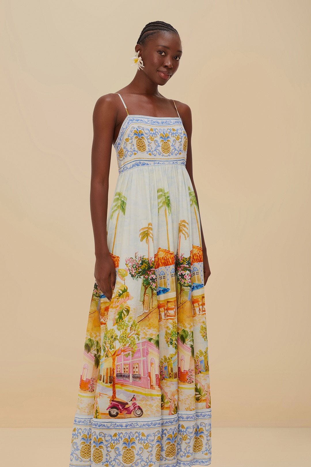 Step into a world of vibrant elegance with this maxi dress. Showcasing a mesmerizing fusion of playful hues and exquisite nature-inspired patterns, this dress effortlessly captures the essence of tropical charm. Its flowing silhouette drapes beautifully, while the square neckline adds a touch of classic sophistication. Perfect for sunlit gatherings or moonlit strolls, this maxi dress is a celebration of joyful style. By Farm Rio. Pair with your favorite Carrie Dunham bag!