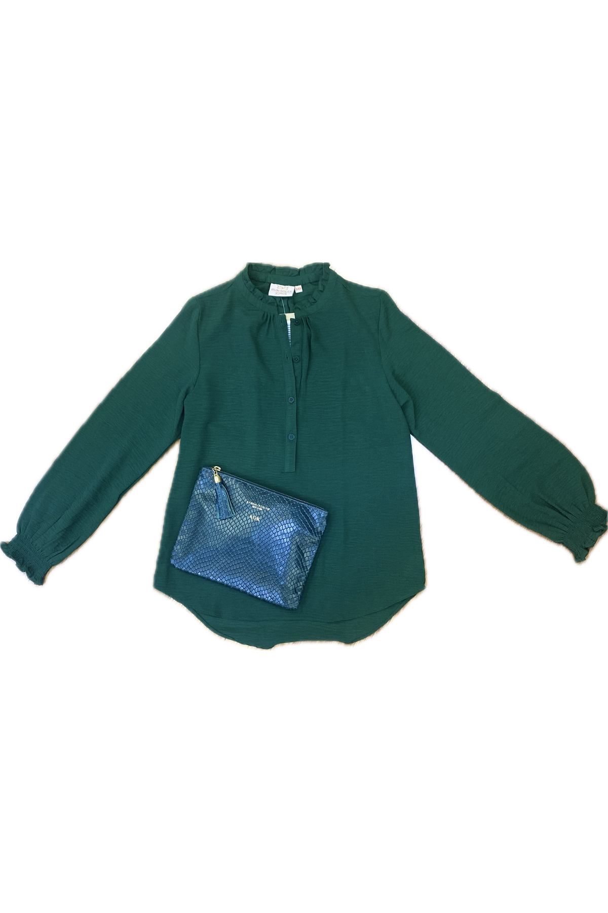 This blouse is made from the softest crepe de chine, this blouse adds the perfect touch of femininity to any outfit. Pair with boots or loafers and a cashmere shawl for an easy transition into Fall! By Rungolee. Pair with your favorite Carrie Dunham bag and cover.