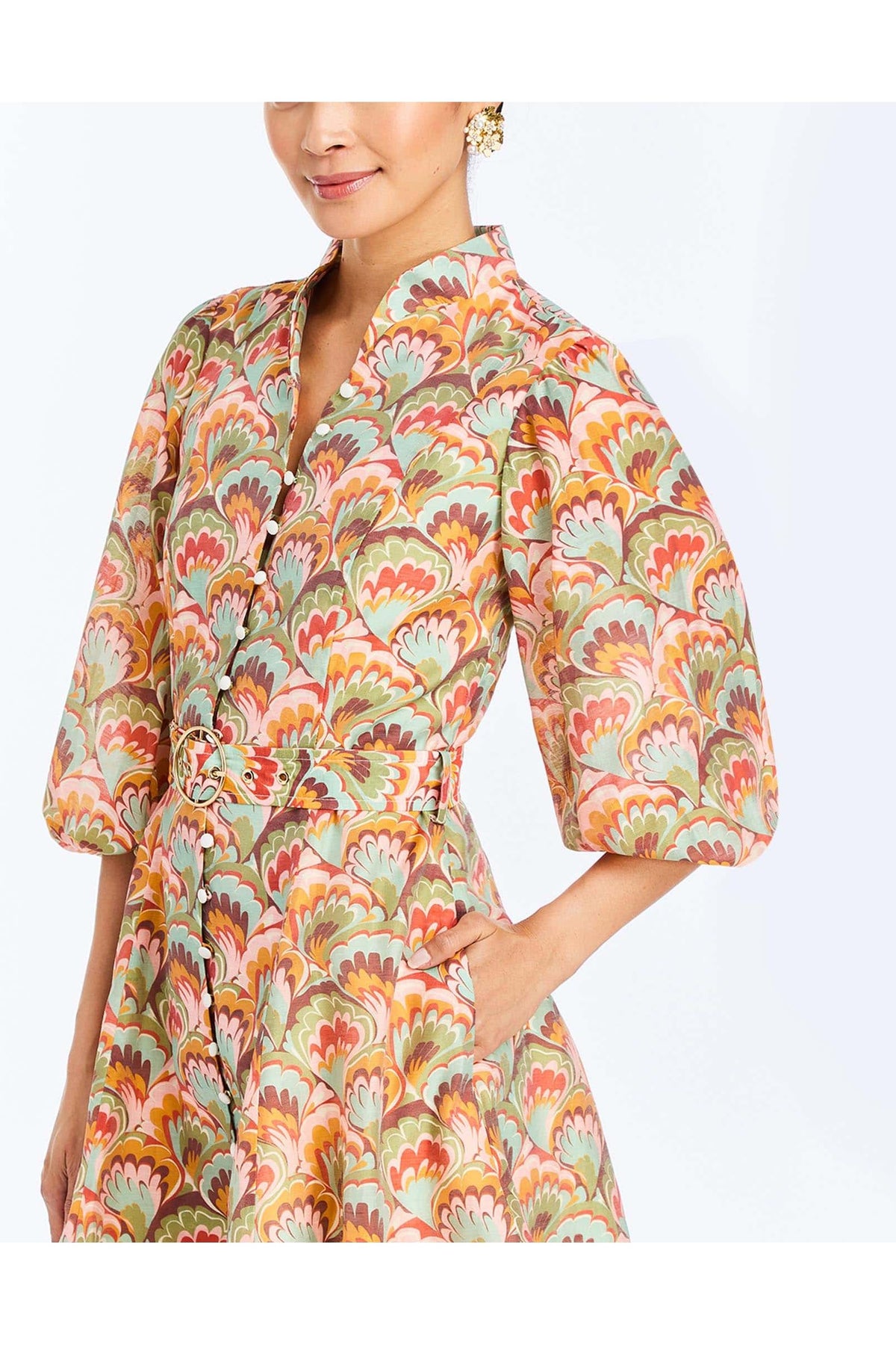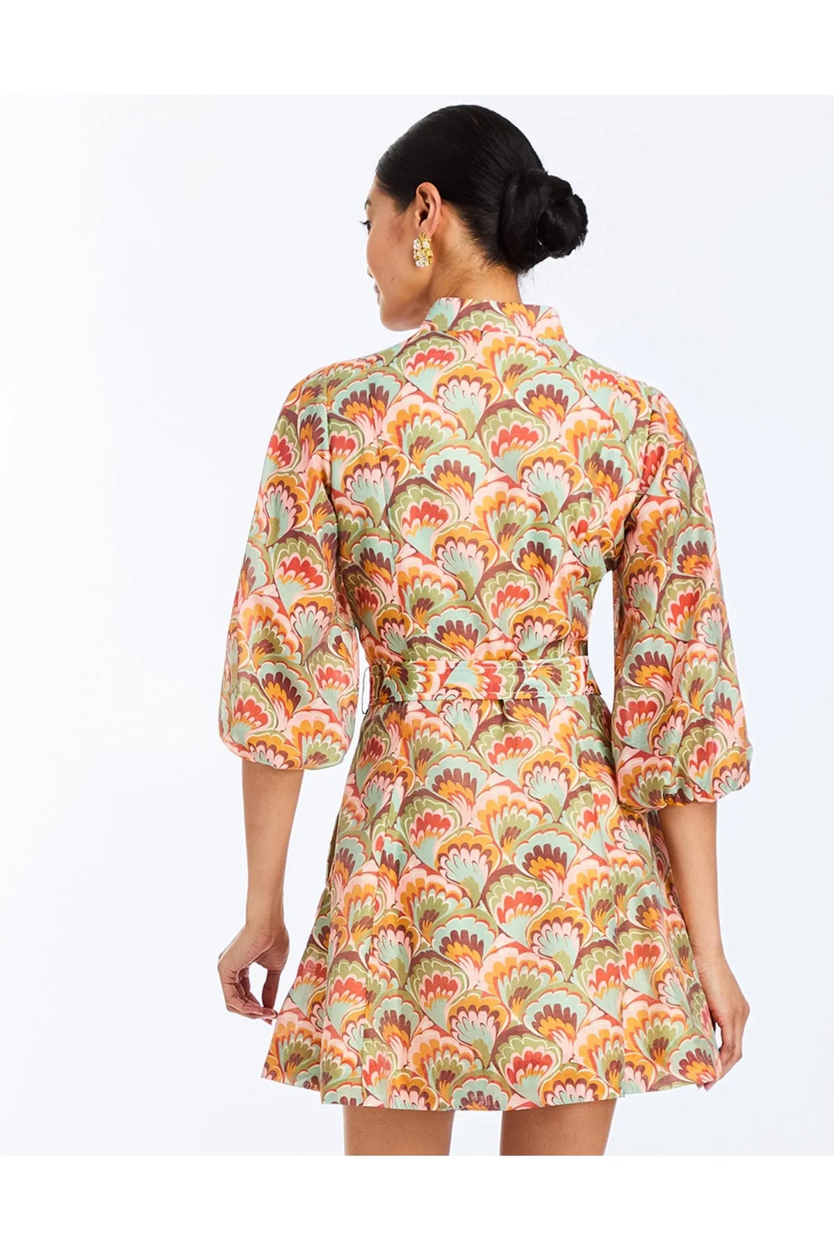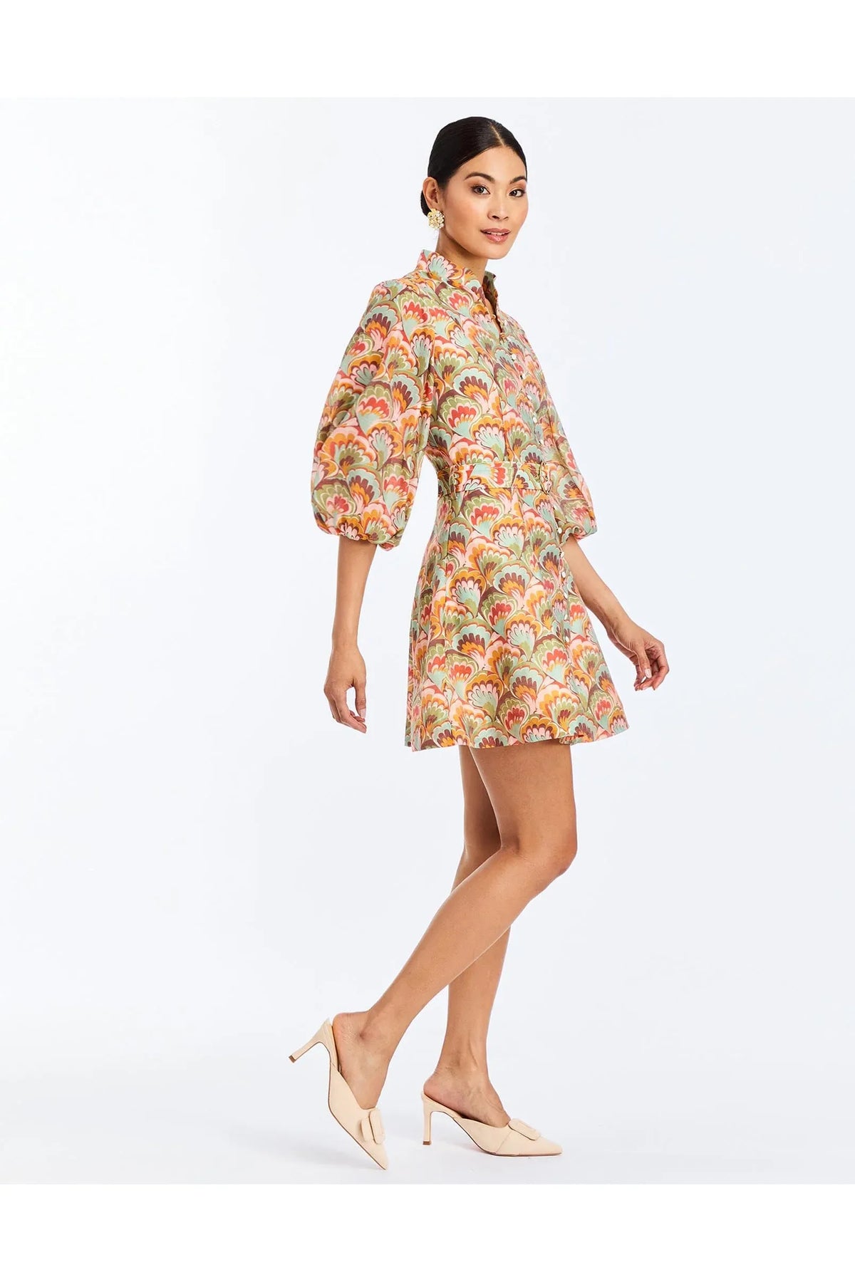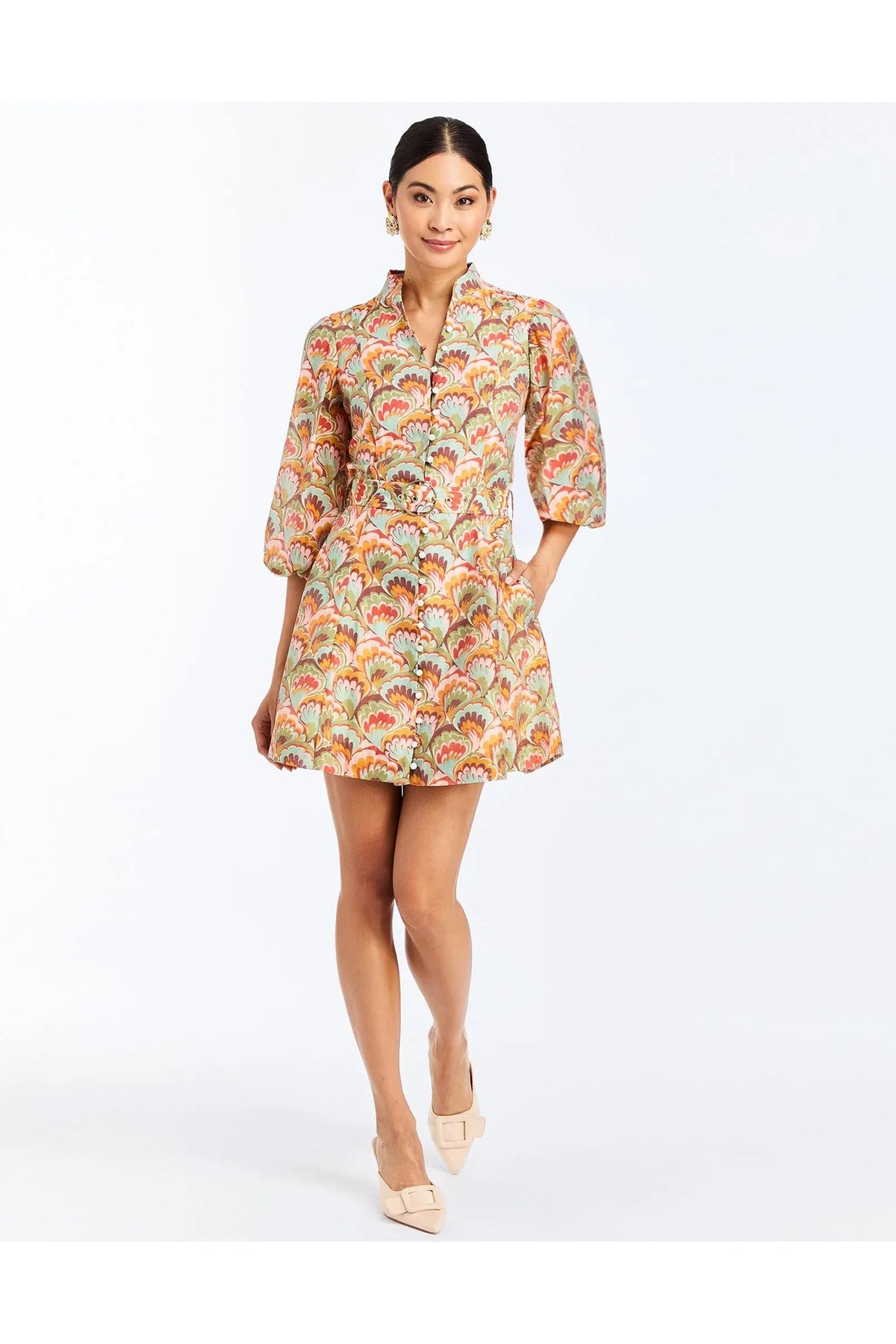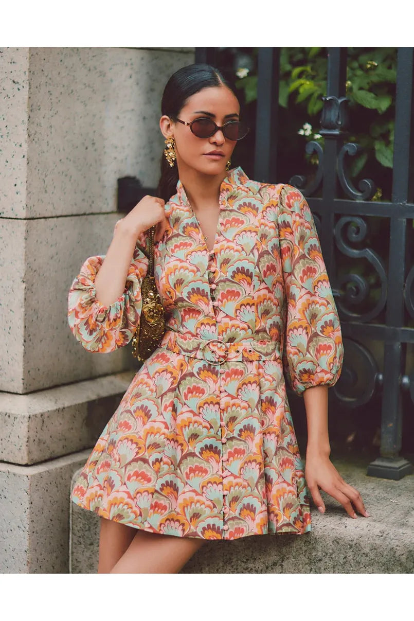 This Mini Dress in a fall-forward marbled multi print, is a perfect addition to your wardrobe. Crafted from a breathable linen organza blend with signature tailoring details. This fit-and-flare mini features a mandarin collar with a V-neckline, elasticized balloon sleeves, and a matching self-fabric belt to accentuate the waist. Polished yet playful, it’s the perfect transitional piece for brunch, casual gatherings, or everyday elevated style. By Mestiza. Pair it with your favorite Carrie Dunham bag for a complete outfit!