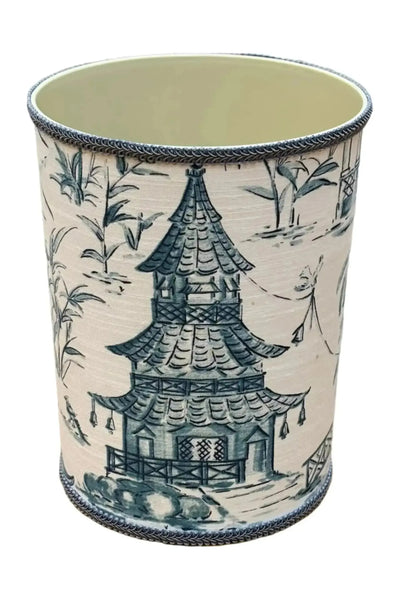 Exceptionally gorgeous fabric with braid trim over a wipe-clean plastic waste basket.