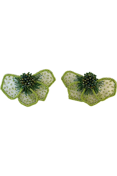 These earrings are a celebration of delicate blooms, where the play of transparency harmonizes with elegance. Handcrafted with crystals, glass beads, and embroidery on silk organza.