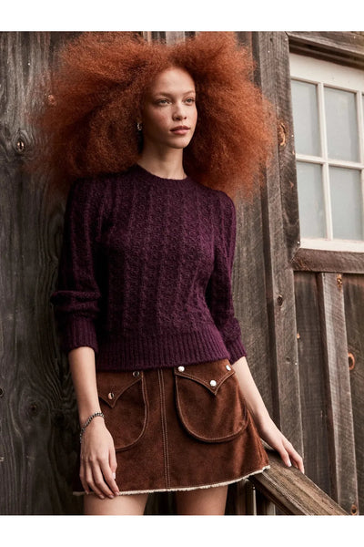 This stunning sweater style and color you will live in this Fall/Winter! From the exquisite textured stitching to the slight puffed sleeves, this pullover style has an easy straight fit that elevates any look. Pair with a gorgeous suede or hair on hide Carrie Dunham Bag to complete your look!